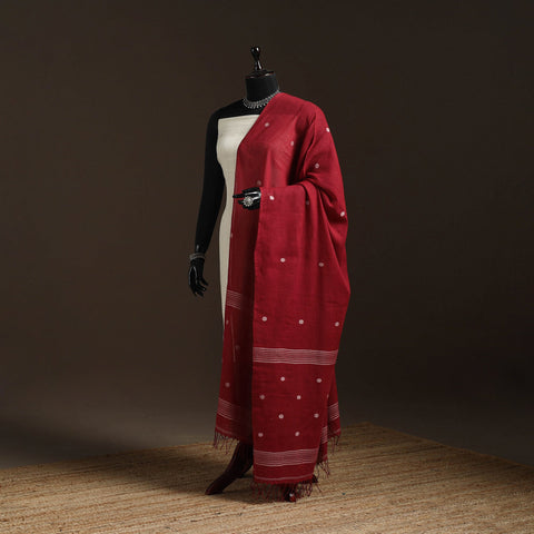 Red handloom pure cotton jamdani dupatta with tassels is crafted by skilled artisans of Bengal. Jamdani’s is extra-weft weaving technique creates delicate embroidery like patterns directly on the loom. The traditional jamdani motifs woven in the dupatta complete this elegant masterpiece. A perfect blend of tradition this lightweight dupatta is ideal for both special occasions and everyday wear.