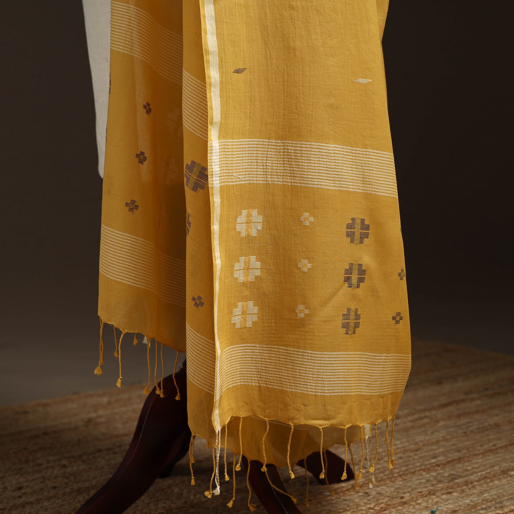 Yellow handloom pure cotton jamdani dupatta with tassels is crafted by skilled artisans of Bengal. Jamdani’s is extra-weft weaving technique creates delicate embroidery like patterns directly on the loom. The traditional jamdani motifs woven in the dupatta complete this elegant masterpiece. A perfect blend of tradition this lightweight dupatta is ideal for both special occasions and everyday wear.