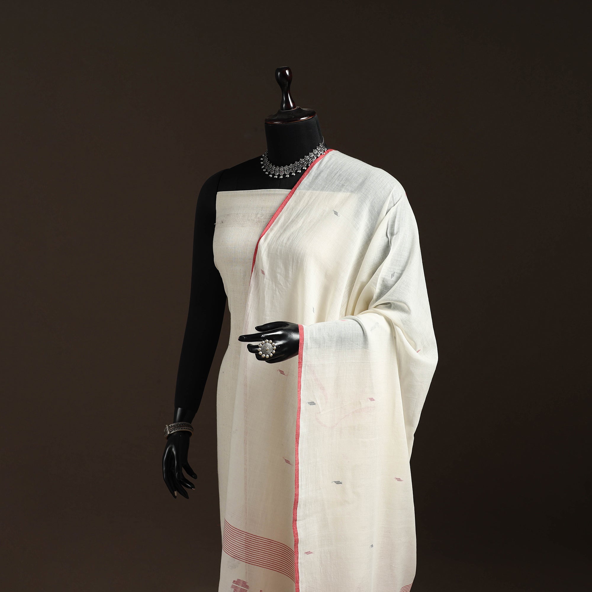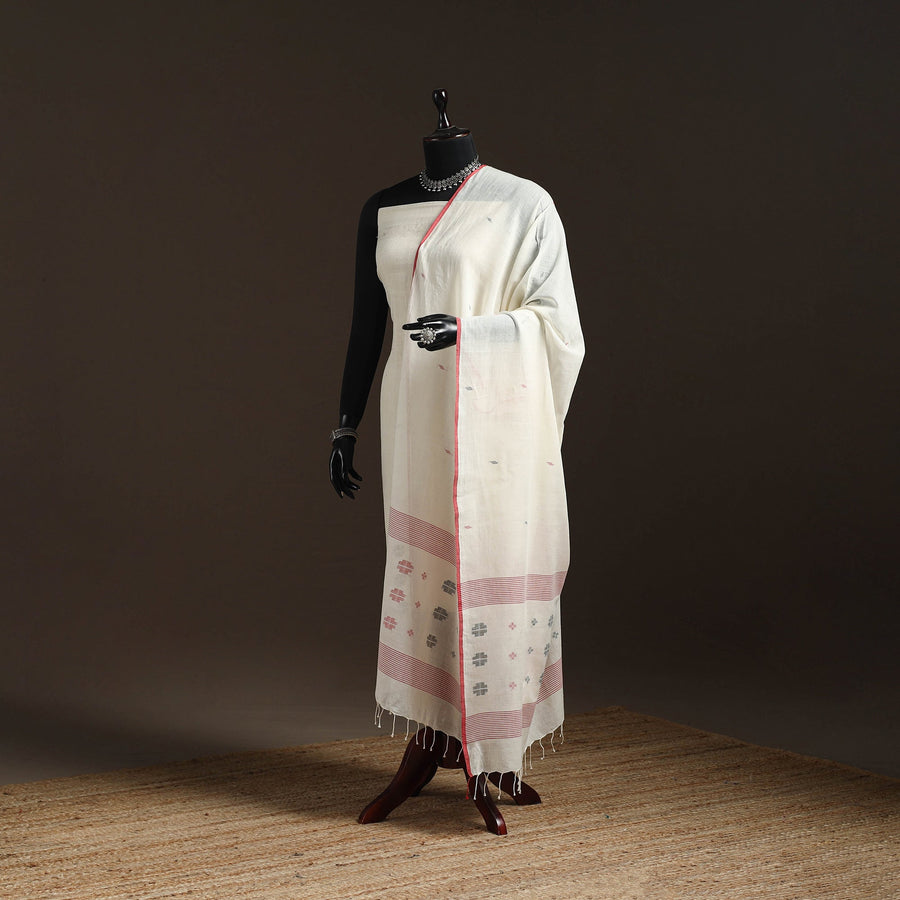 | Material | White handloom pure cotton jamdani dupatta with tassels is crafted by skilled artisans of Bengal. Jamdani’s is extra-weft weaving technique creates delicate embroidery like patterns directly on the loom. The traditional jamdani motifs woven in the dupatta complete this elegant masterpiece. A perfect blend of tradition this lightweight dupatta is ideal for both special occasions and everyday wear. Note: This piece carries tiny knots, thread pulls, or uneven lines not flaws, but fingerprints. Every irregularity is a whisper from the hands that made it. It’s what happens when tradition weaves through time, not machines. If you’re looking for perfection, this isn’t it. But if you’re looking for soul you’ve found it. |