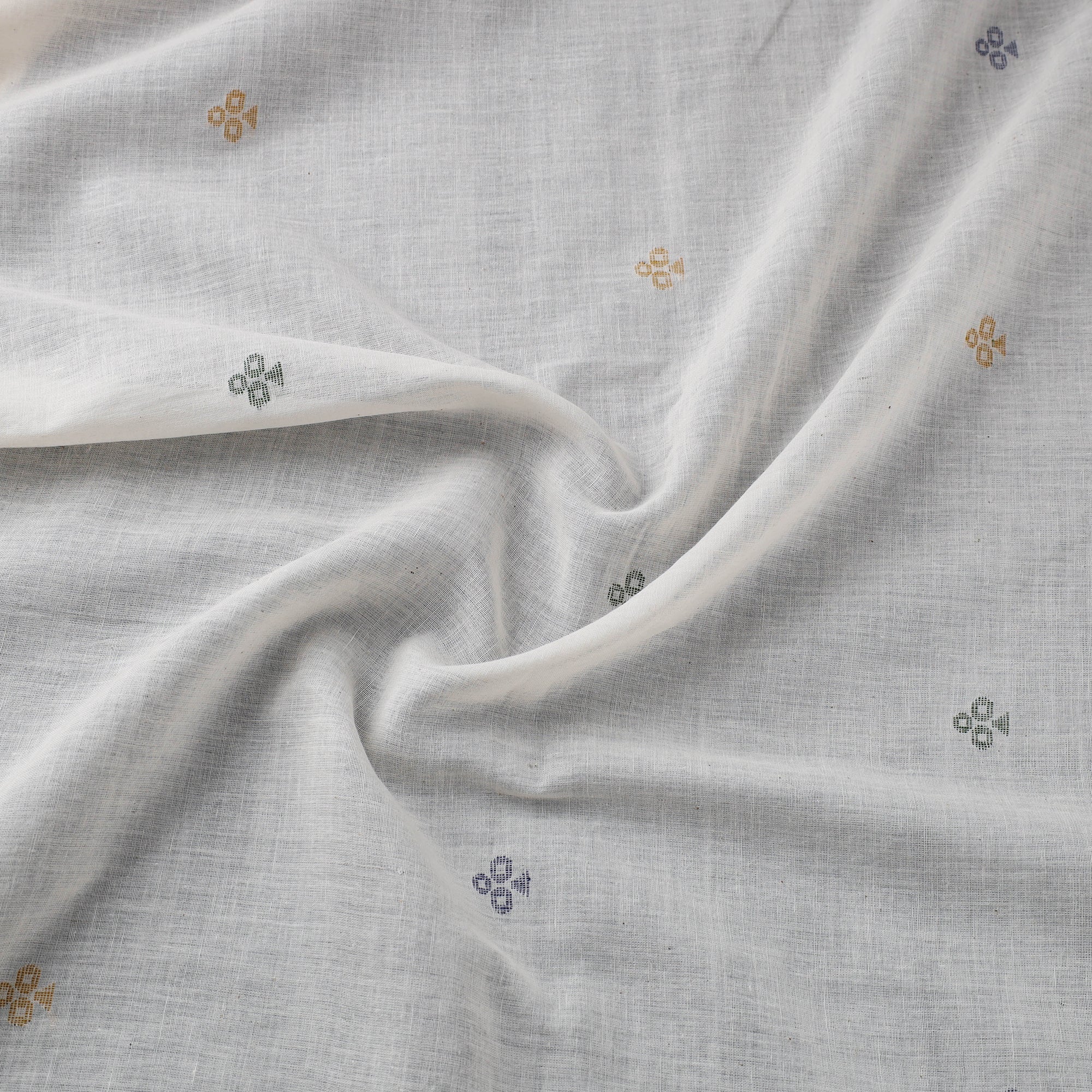 This white handloom cotton jamdani fabric is woven by skilled artisans of Bengal. The base is made using unbleached cotton yarn, while the motifs are inserted using bleached cotton yarn to create a delicate light-and-dark contrast. The process is time-intensive, involving an intricate form of supplementary weft weaving. This exquisite textile is perfect for sarees, dupattas, kurtas, or elegant home decor, adding a timeless touch of tradition to every creation.