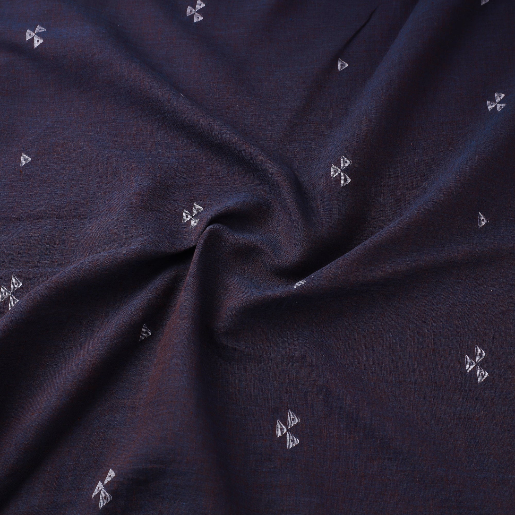 This blue handloom cotton jamdani fabric is woven by skilled artisans of Bengal. The base is made using unbleached cotton yarn, while the motifs are inserted using bleached cotton yarn to create a delicate light-and-dark contrast. The process is time-intensive, involving an intricate form of supplementary weft weaving. This exquisite textile is perfect for sarees, dupattas, kurtas, or elegant home decor, adding a timeless touch of tradition to every creation.