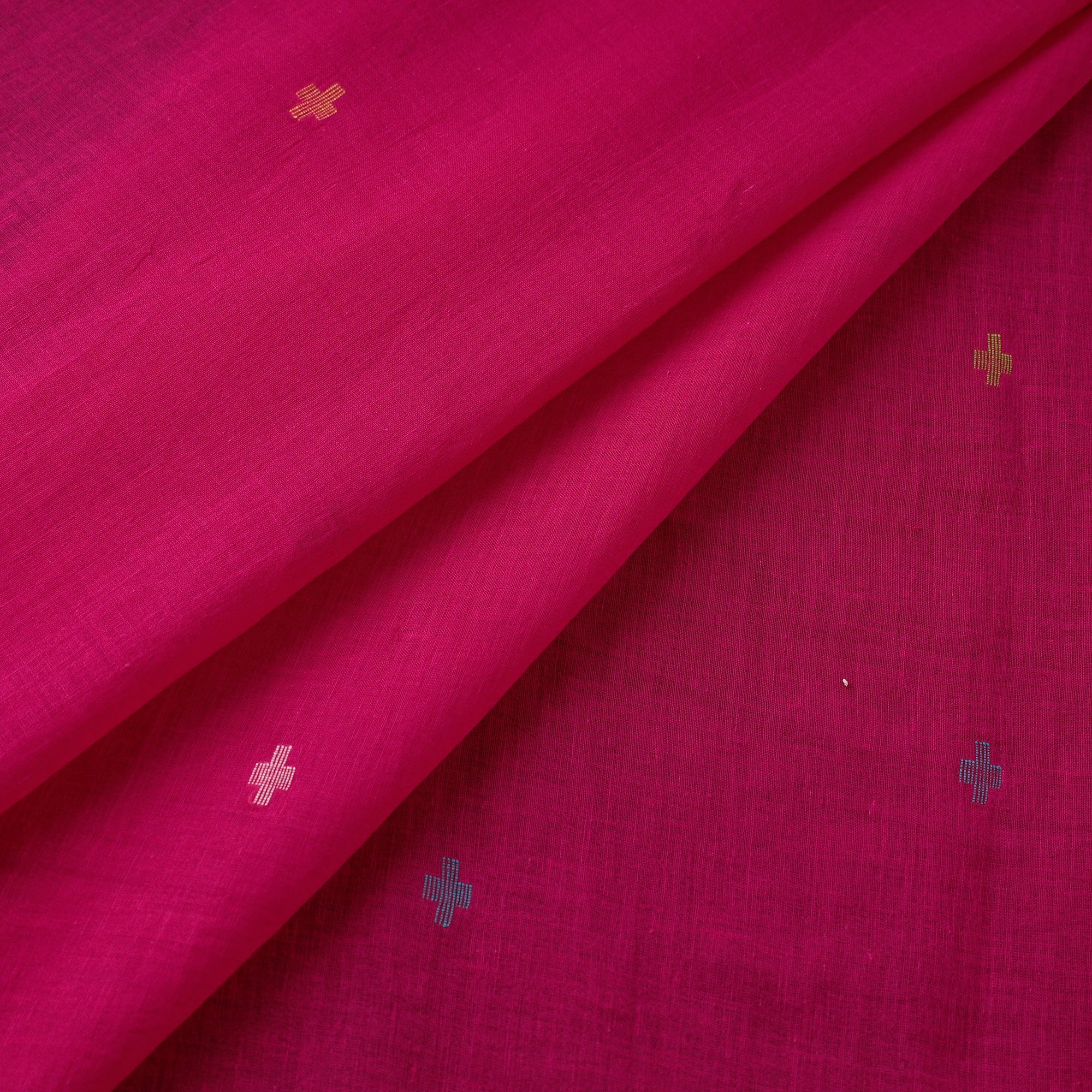 This pink handloom cotton jamdani fabric is woven by skilled artisans of Bengal. The base is made using unbleached cotton yarn, while the motifs are inserted using bleached cotton yarn to create a delicate light-and-dark contrast. The process is time-intensive, involving an intricate form of supplementary weft weaving. This exquisite textile is perfect for sarees, dupattas, kurtas, or elegant home decor, adding a timeless touch of tradition to every creation.