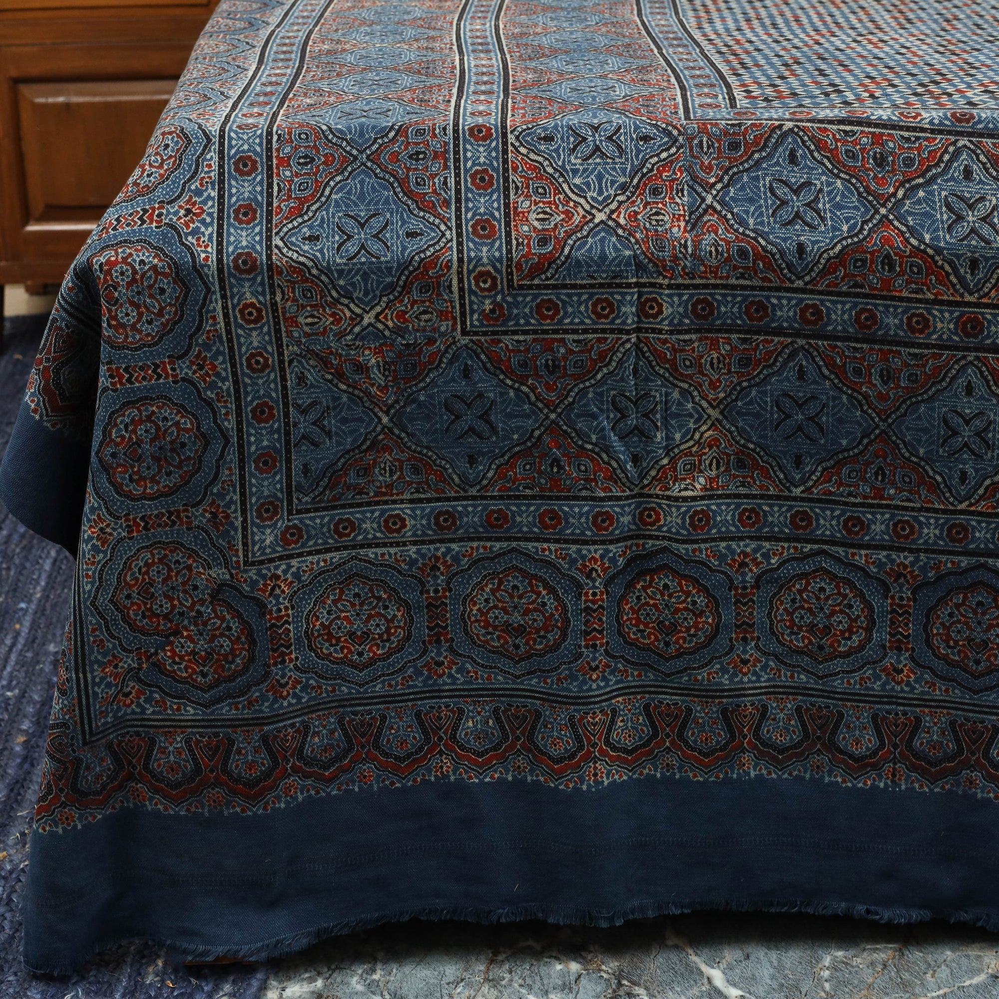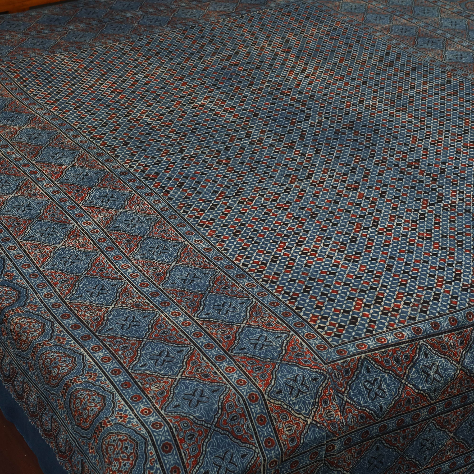 Experience the artistry of Kutch with this blue handloom cotton ajrakh double bedsheet by Jabbar Khatri. Crafted using centuries-old block printing techniques and natural dyes, each piece showcases intricate geometric patterns. Breathable and durable, it’s perfect for everyday use or festive settings.