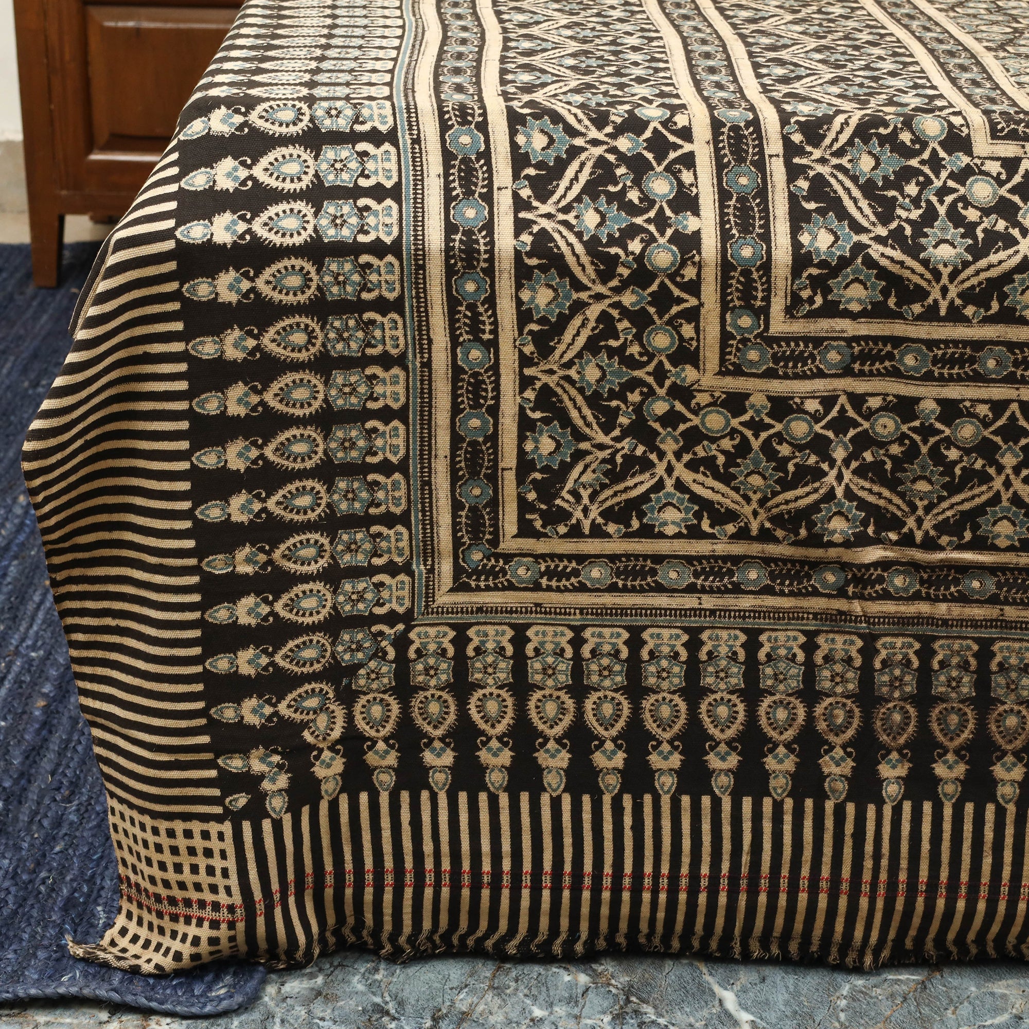 Experience the artistry of Kutch with this brown handloom cotton ajrakh double bedsheet by Jabbar Khatri. Crafted using centuries-old block printing techniques and natural dyes, each piece showcases intricate geometric patterns. Breathable and durable, it’s perfect for everyday use or festive settings.