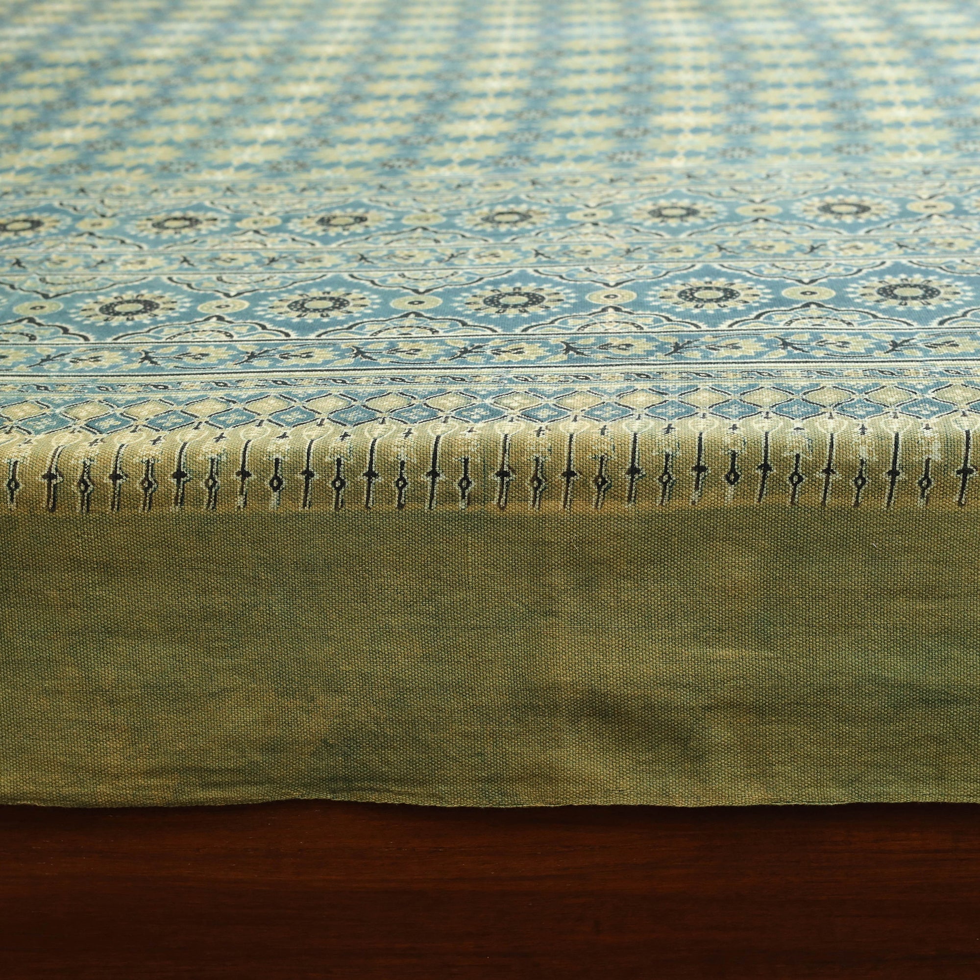 Experience the artistry of Kutch with this green handloom cotton ajrakh double bedsheet by Jabbar Khatri. Crafted using centuries-old block printing techniques and natural dyes, each piece showcases intricate geometric patterns. Breathable and durable, it’s perfect for everyday use or festive settings.
