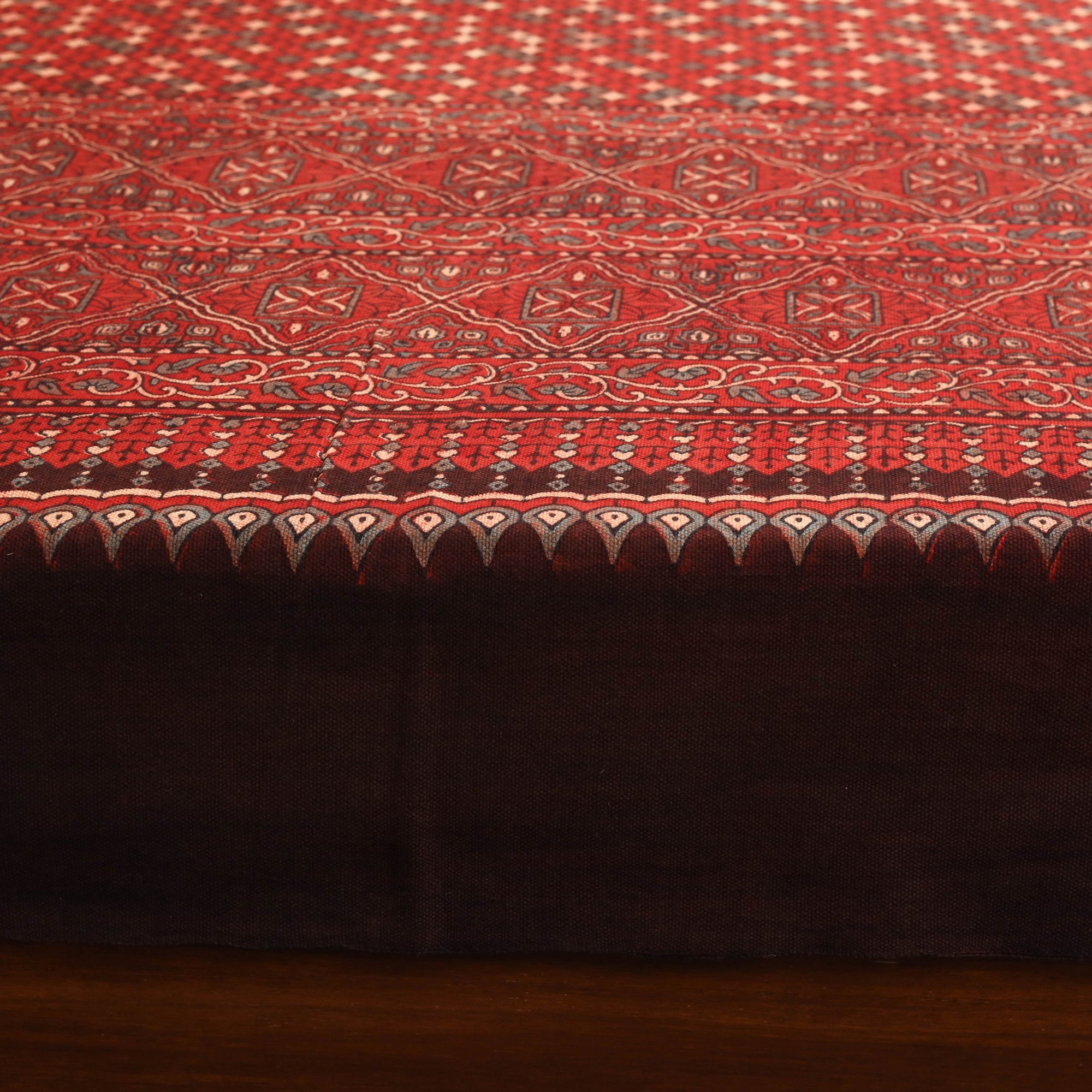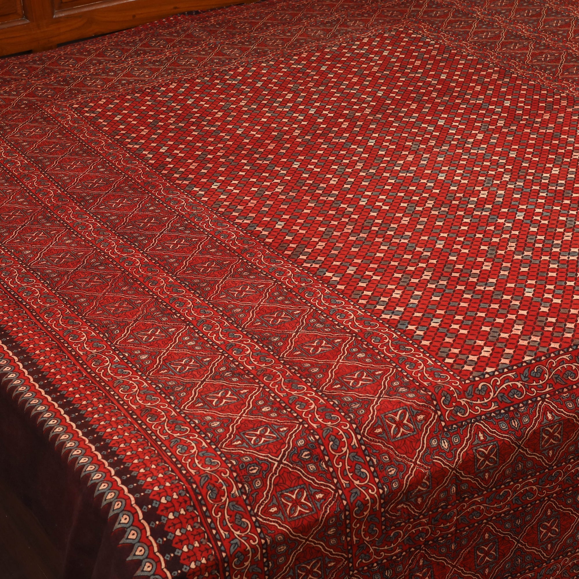 Experience the artistry of Kutch with this red handloom cotton ajrakh double bedsheet by Jabbar Khatri. Crafted using centuries-old block printing techniques and natural dyes, each piece showcases intricate geometric patterns. Breathable and durable, it’s perfect for everyday use or festive settings.
