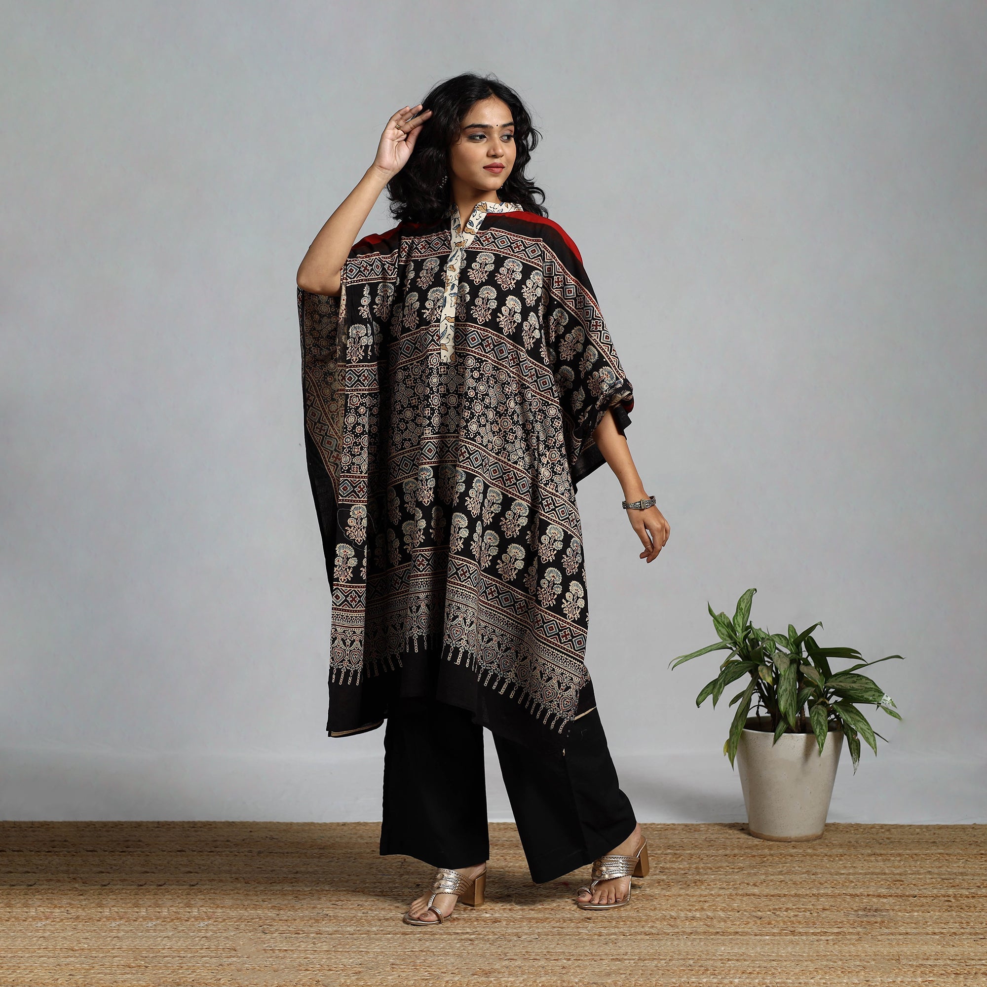 Ajrakh handloom cotton medium kaftan is crafted using traditional natural-dyeing and resist block-printing techniques practiced for generations in the Kutch region. Ajrakh is an ancient craft estimated to be nearly 4,500 years old, known for its deep, earthy colours and geometric layouts. The printing process is long and intricate, involving multiple stages of washing, dyeing, and resist application. It also includes a shibori tie-dye pattern on the fabric. Designed in a comfortable kaftan silhouette, it comes with tassels, offering a relaxed fit and airy drape, making it ideal for everyday wear, lounging, or casual outings.