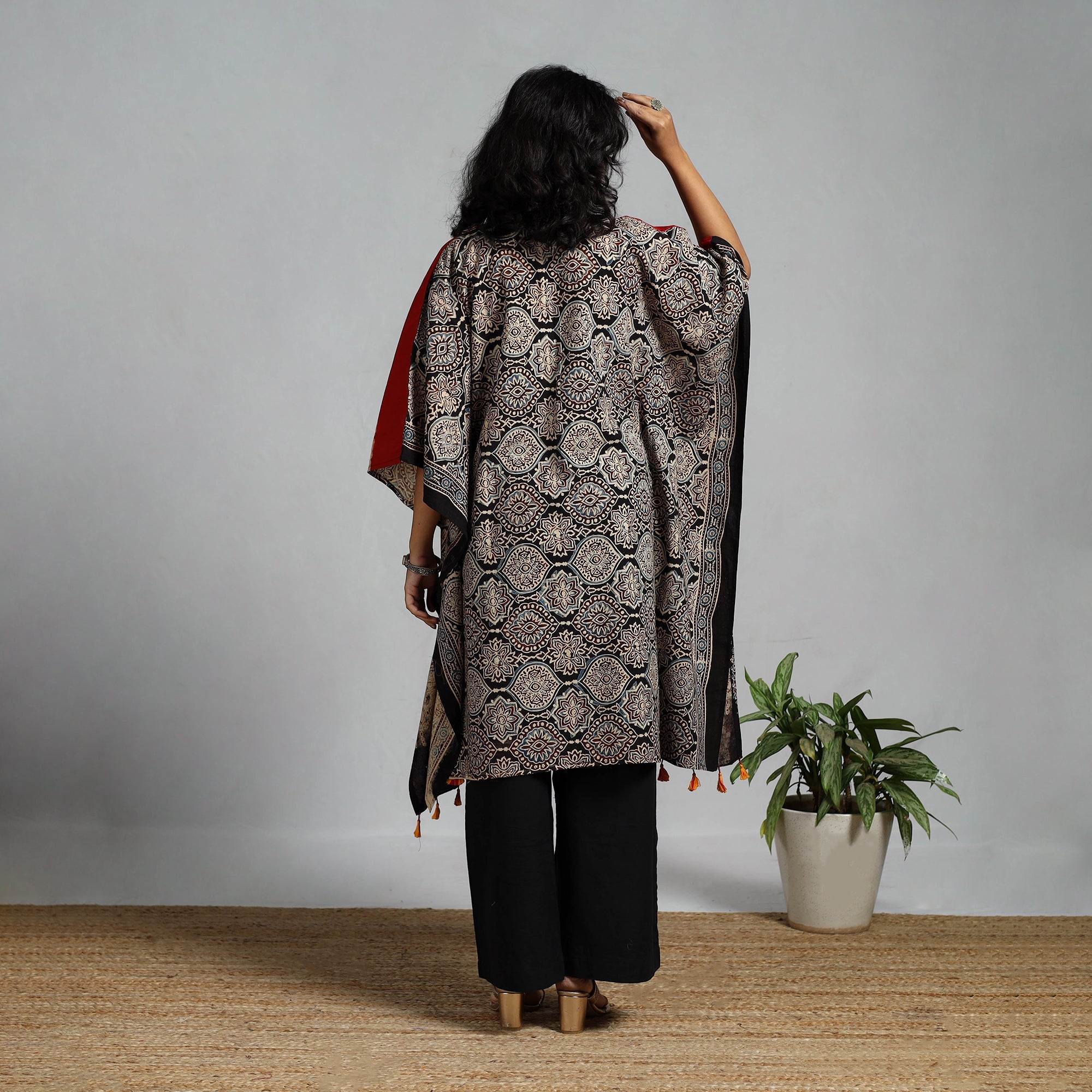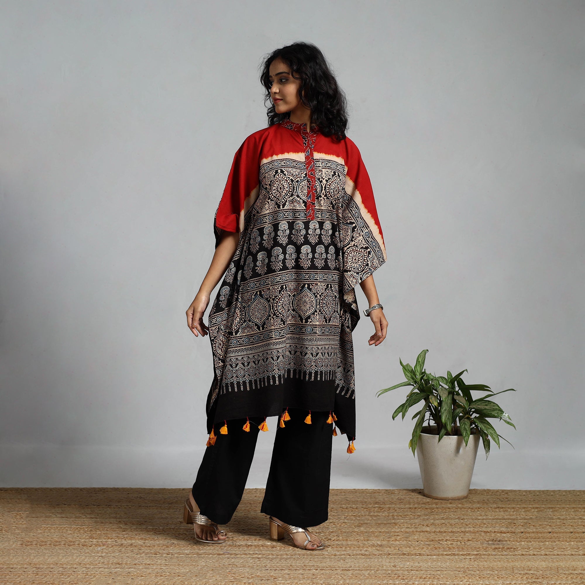Ajrakh handloom cotton medium kaftan is crafted using traditional natural-dyeing and resist block-printing techniques practiced for generations in the Kutch region. Ajrakh is an ancient craft estimated to be nearly 4,500 years old, known for its deep, earthy colours and geometric layouts. The printing process is long and intricate, involving multiple stages of washing, dyeing, and resist application. It also includes a shibori tie-dye pattern on the fabric. Designed in a comfortable kaftan silhouette, it comes with tassels, offering a relaxed fit and airy drape, making it ideal for everyday wear, lounging, or casual outings.