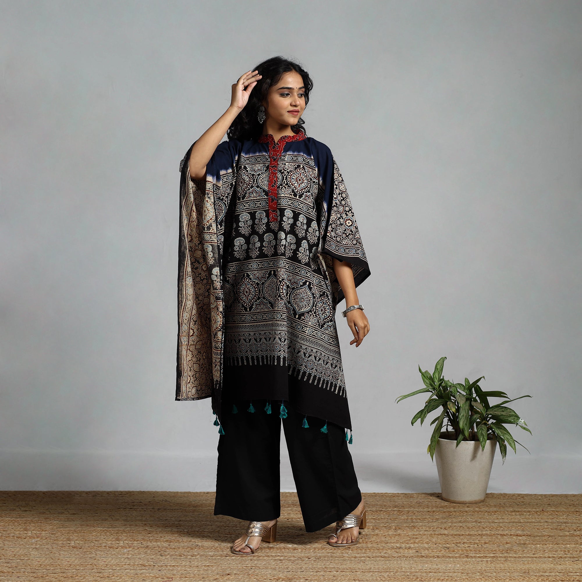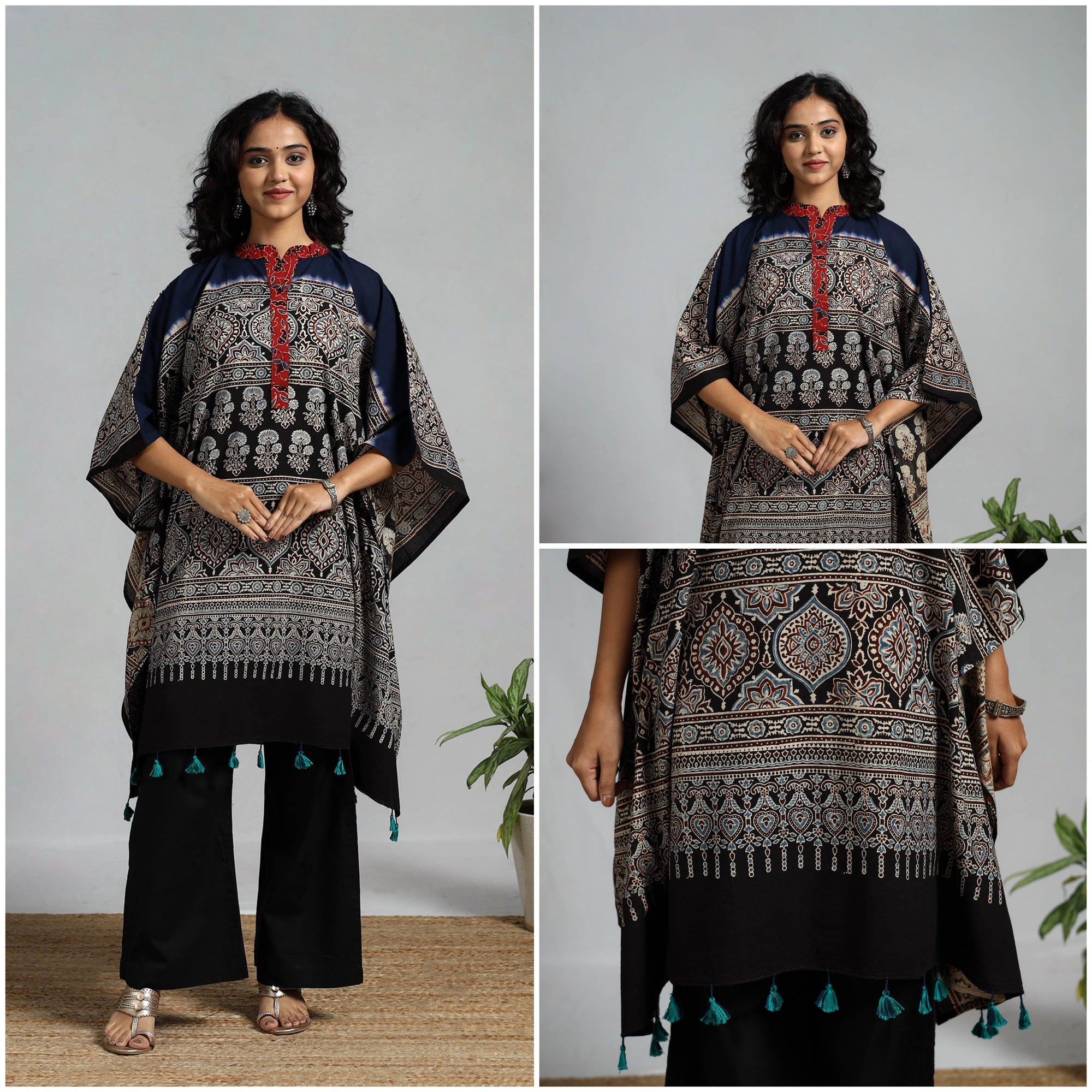 Ajrakh handloom cotton medium kaftan is crafted using traditional natural-dyeing and resist block-printing techniques practiced for generations in the Kutch region. Ajrakh is an ancient craft estimated to be nearly 4,500 years old, known for its deep, earthy colours and geometric layouts. The printing process is long and intricate, involving multiple stages of washing, dyeing, and resist application. It also includes a shibori tie-dye pattern on the fabric. Designed in a comfortable kaftan silhouette, it comes with tassels, offering a relaxed fit and airy drape, making it ideal for everyday wear, lounging, or casual outings.