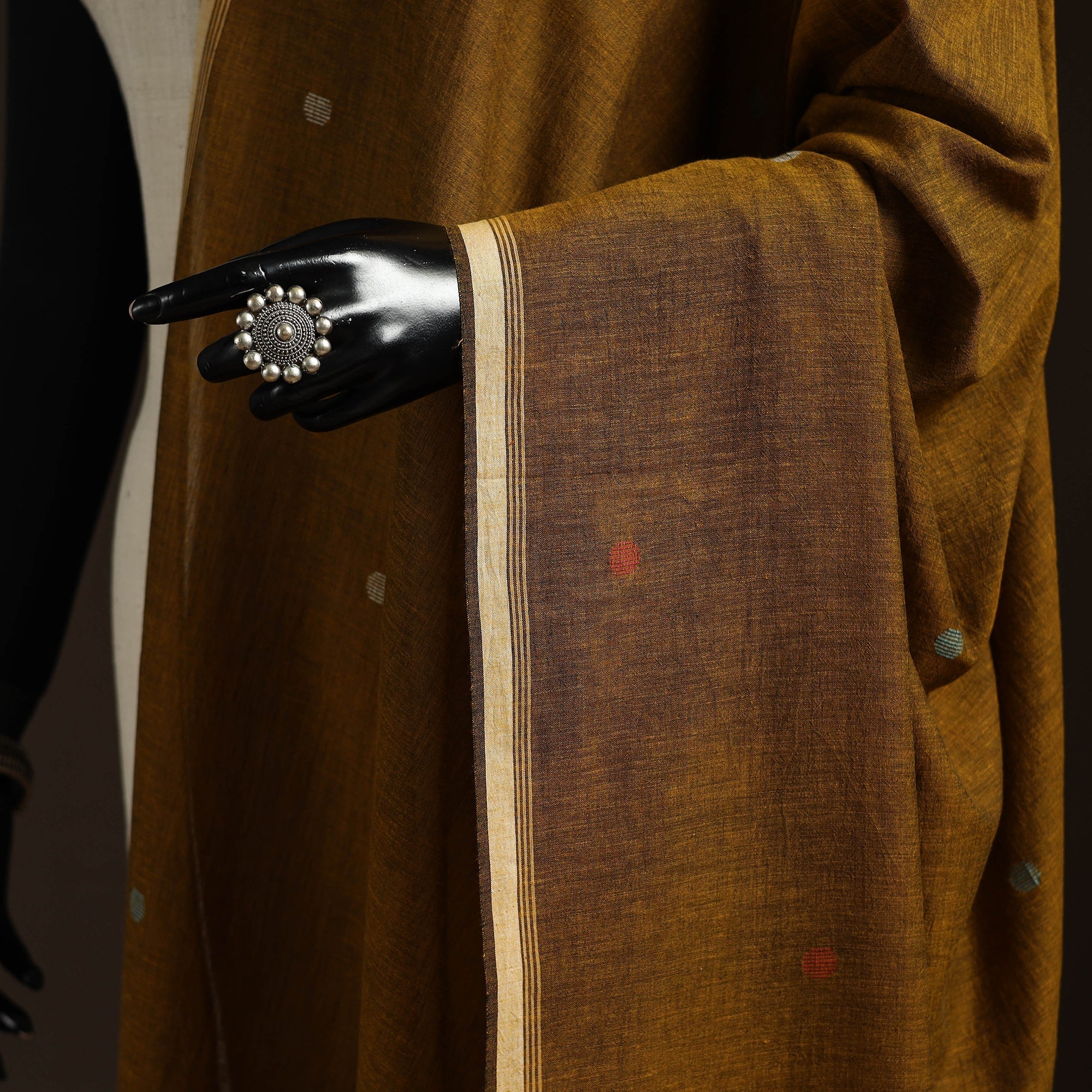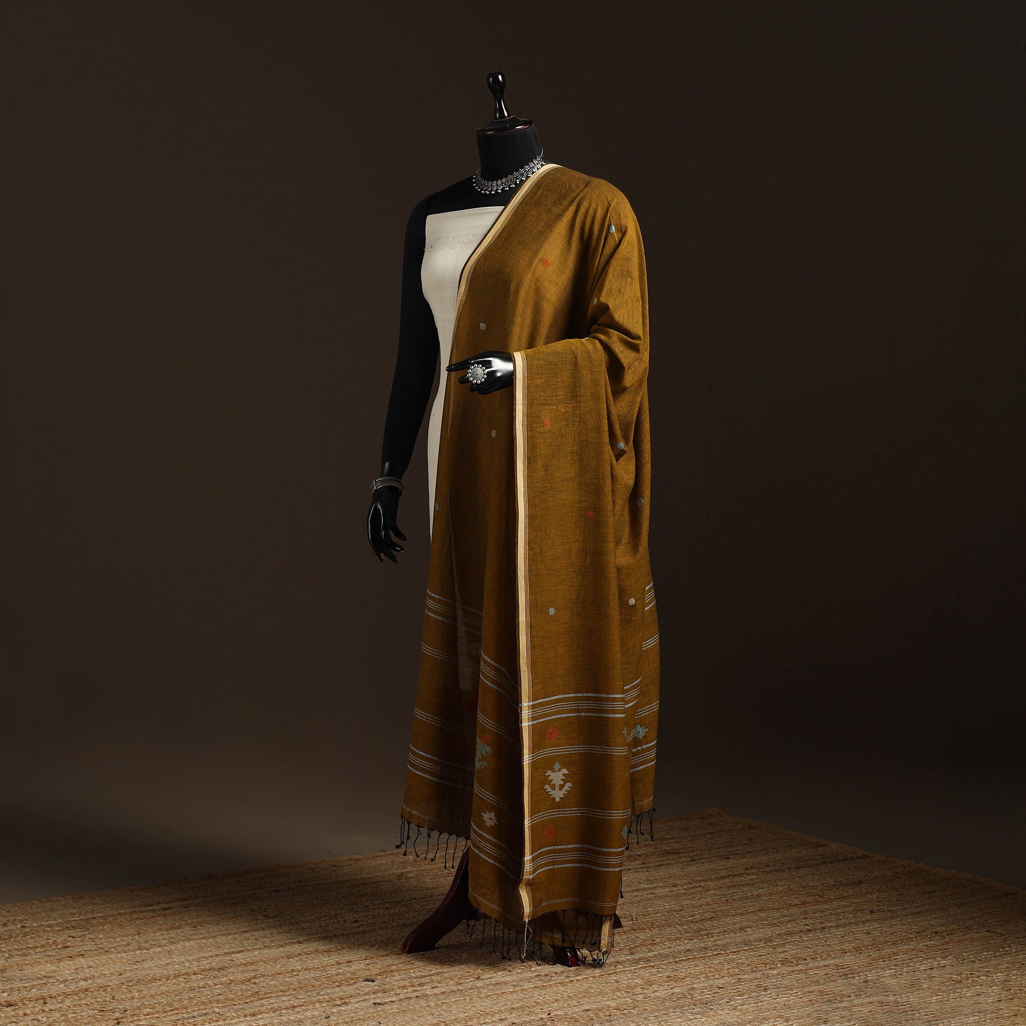 Brown handloom pure cotton burdwan jamdani dupatta with tassels is crafted by skilled artisans of Bengal. Jamdani’s is extra-weft weaving technique creates delicate embroidery like patterns directly on the loom. The traditional jamdani motifs woven in the dupatta complete this elegant masterpiece. A perfect blend of tradition this lightweight dupatta is ideal for both special occasions and everyday wear.