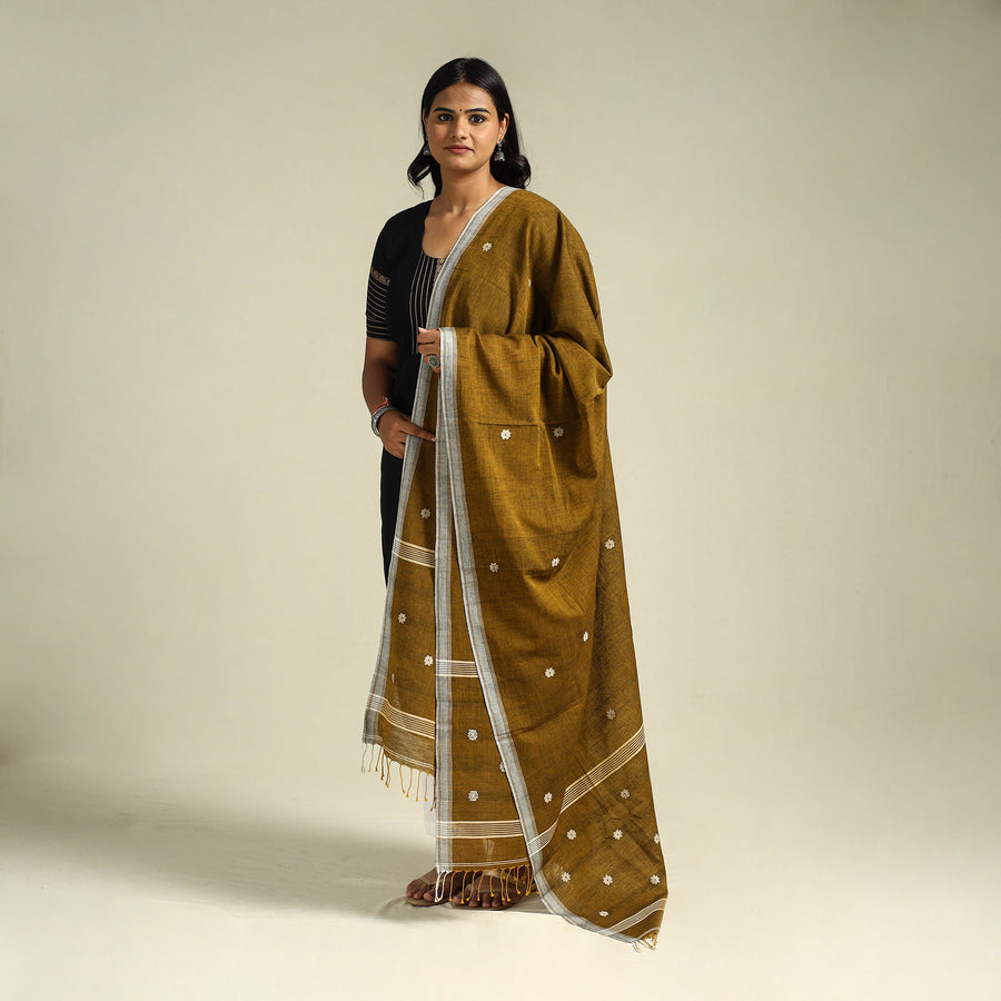 This brown handloom cotton burdwan jamdani dupatta with tassels is crafted by skilled artisans of Bengal. Jamdani’s extra-weft weaving technique, creates delicate embroidery-like patterns directly on the loom. Using small shuttles of coloured threads passed through the warp, the weaving resembles intricate tapestry work. A perfect blend of tradition and charm, this lightweight dupatta is ideal for both special occasions and everyday wear.
