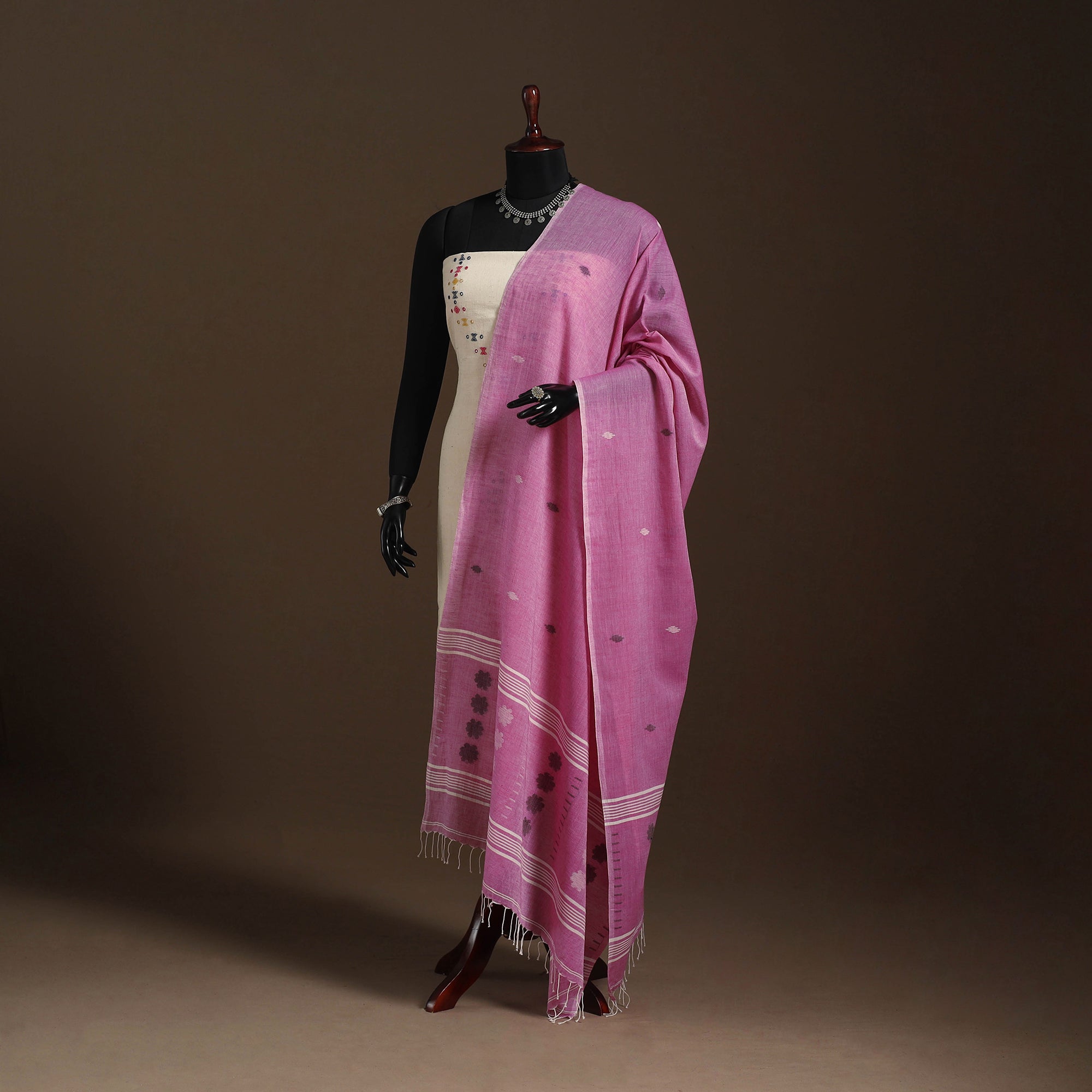 This pink handloom cotton burdwan jamdani dupatta with tassels is crafted by skilled artisans of Bengal. Jamdani’s is extra-weft weaving technique creates delicate embroidery-like patterns directly on the loom. Using small shuttles of coloured threads passed through the warp, the weaving resembles intricate tapestry work. A perfect blend of tradition and charm, this lightweight dupatta is ideal for both special occasions and everyday wear.