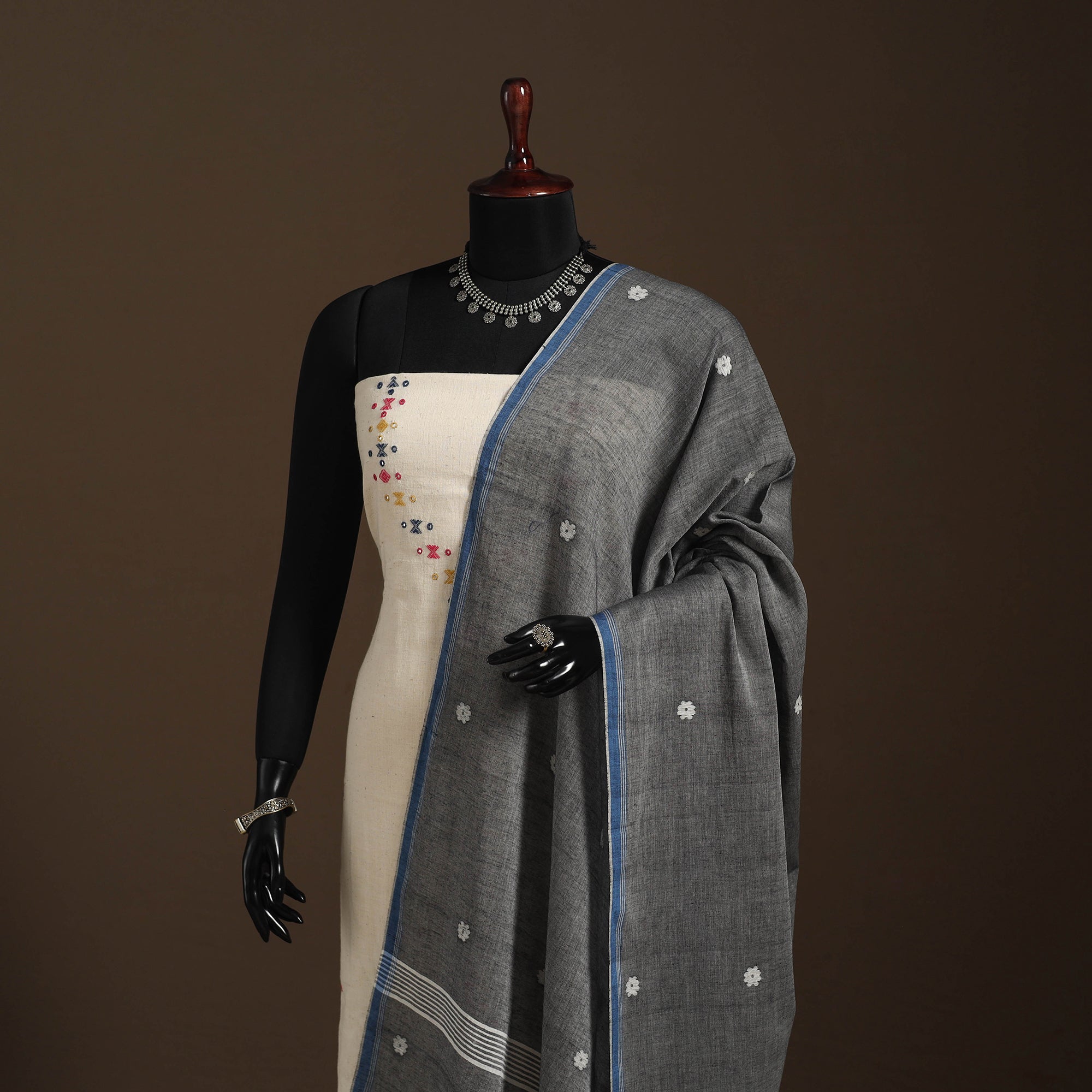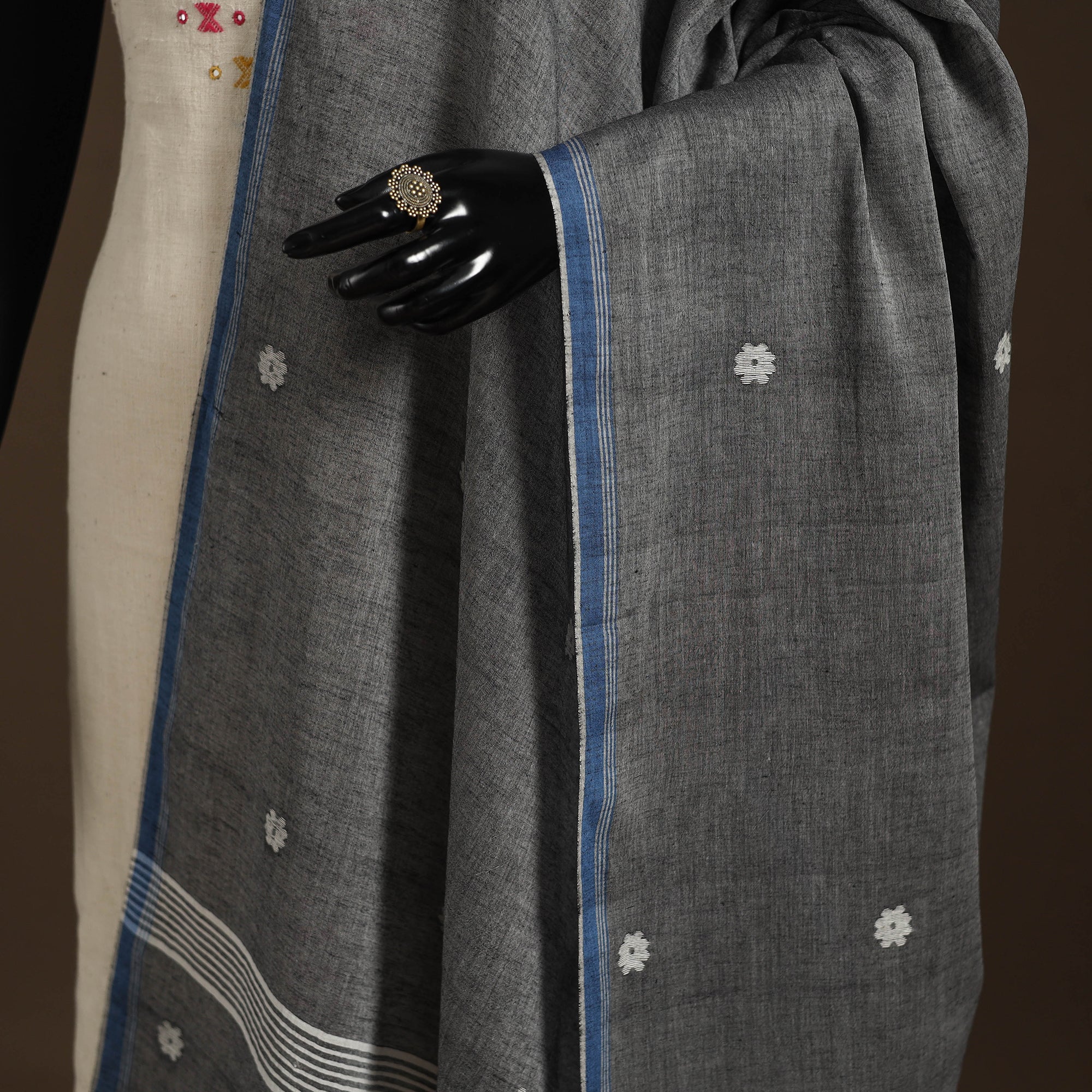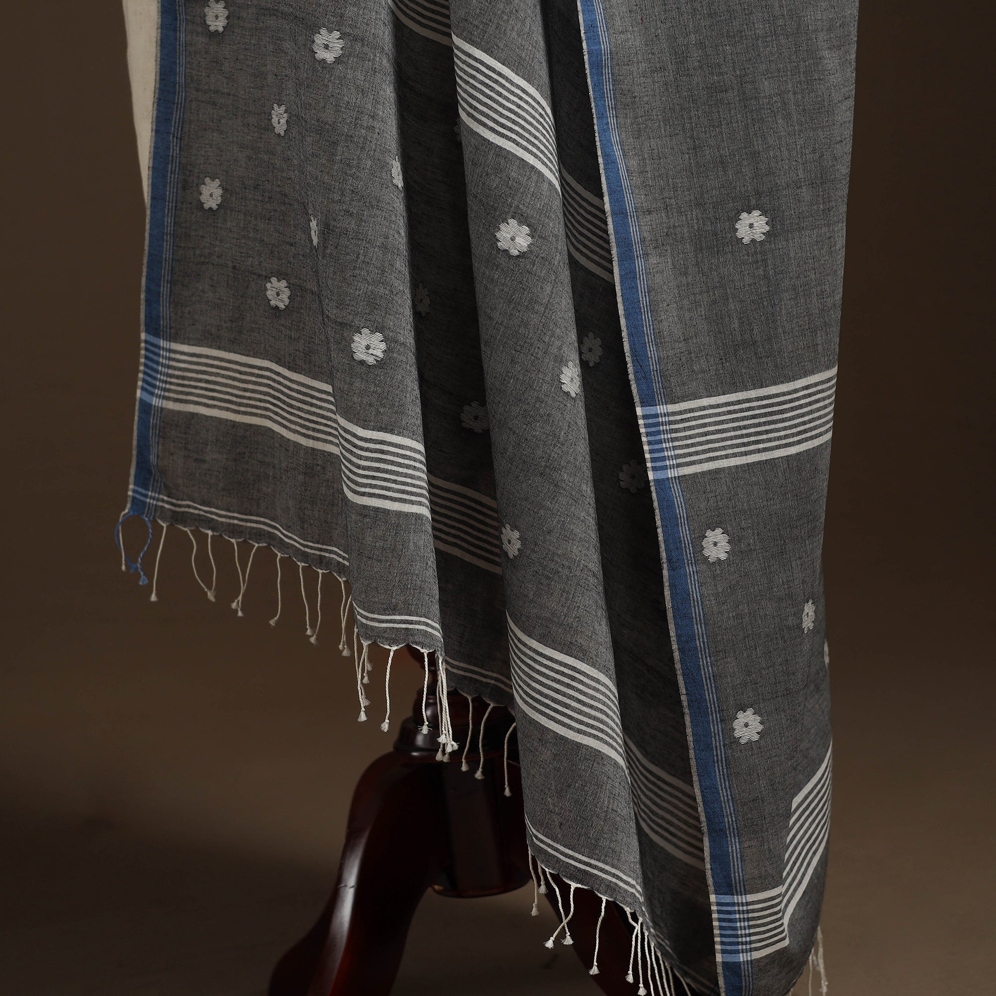 This grey handloom cotton burdwan jamdani dupatta with tassels is crafted by skilled artisans of Bengal. Jamdani’s is extra-weft weaving technique creates delicate embroidery-like patterns directly on the loom. Using small shuttles of coloured threads passed through the warp, the weaving resembles intricate tapestry work. A perfect blend of tradition and charm, this lightweight dupatta is ideal for both special occasions and everyday wear.