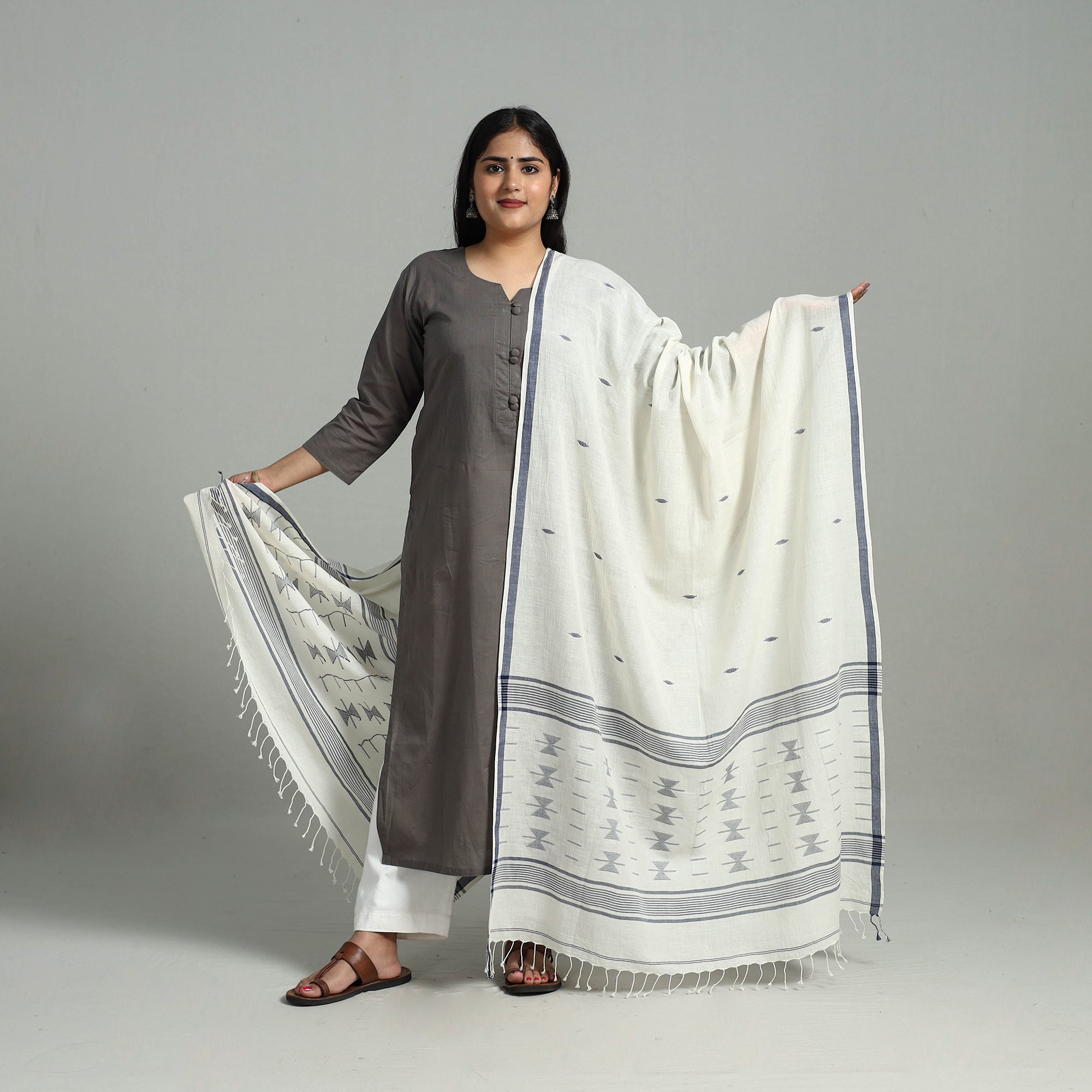 This white handloom cotton burdwan jamdani dupatta with tassels is crafted by the artisans of Bengal. Jamdani extra weft weaving a style unique to bengal literally like hand embroidery on the loom. The method of weaving resembles tapestry work in which small shuttles of coloured, threads are passed through the warp. A perfect blend of tradition and elegance, ideal for both special occasions and everyday wear.