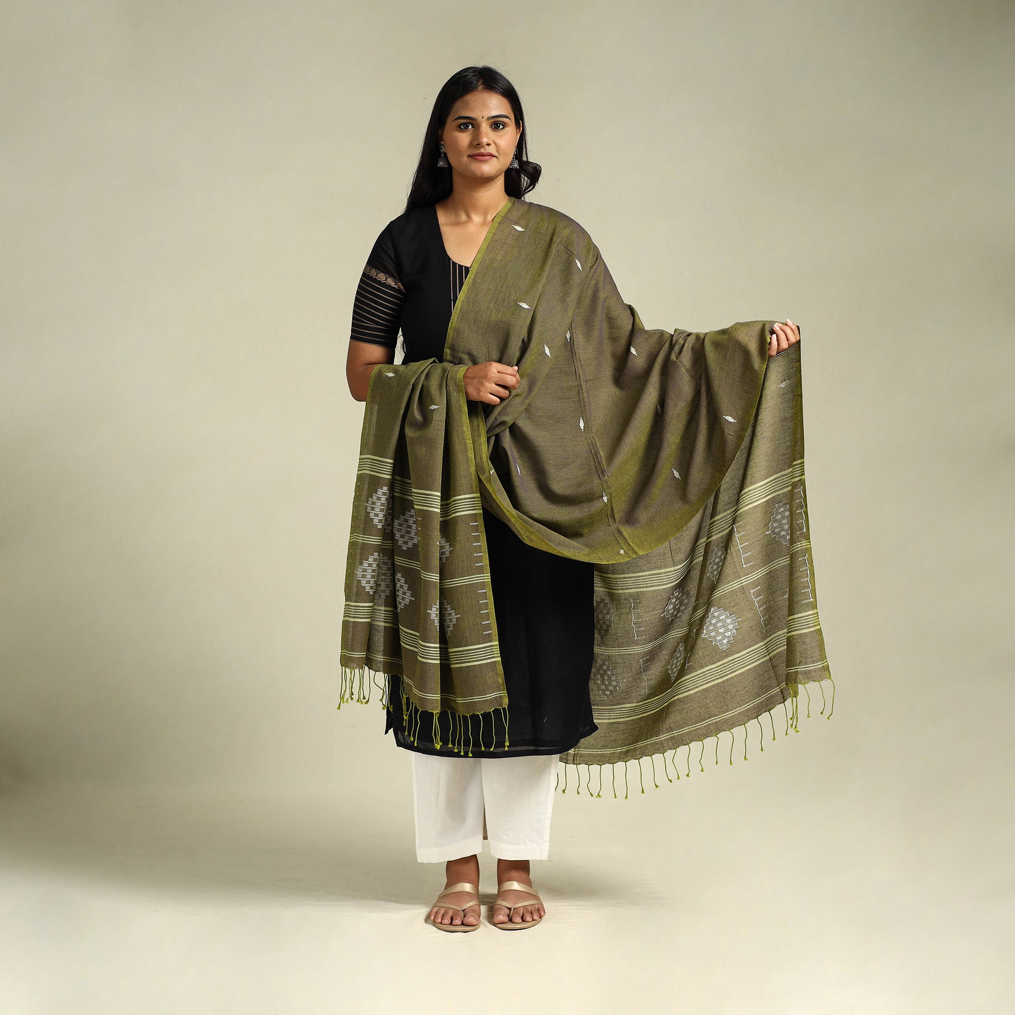 This green handloom cotton burdwan jamdani dupatta with tassels is crafted by skilled artisans of Bengal. Jamdani’s extra-weft weaving technique, creates delicate embroidery-like patterns directly on the loom. Using small shuttles of coloured threads passed through the warp, the weaving resembles intricate tapestry work. A perfect blend of tradition and charm, this lightweight dupatta is ideal for both special occasions and everyday wear.