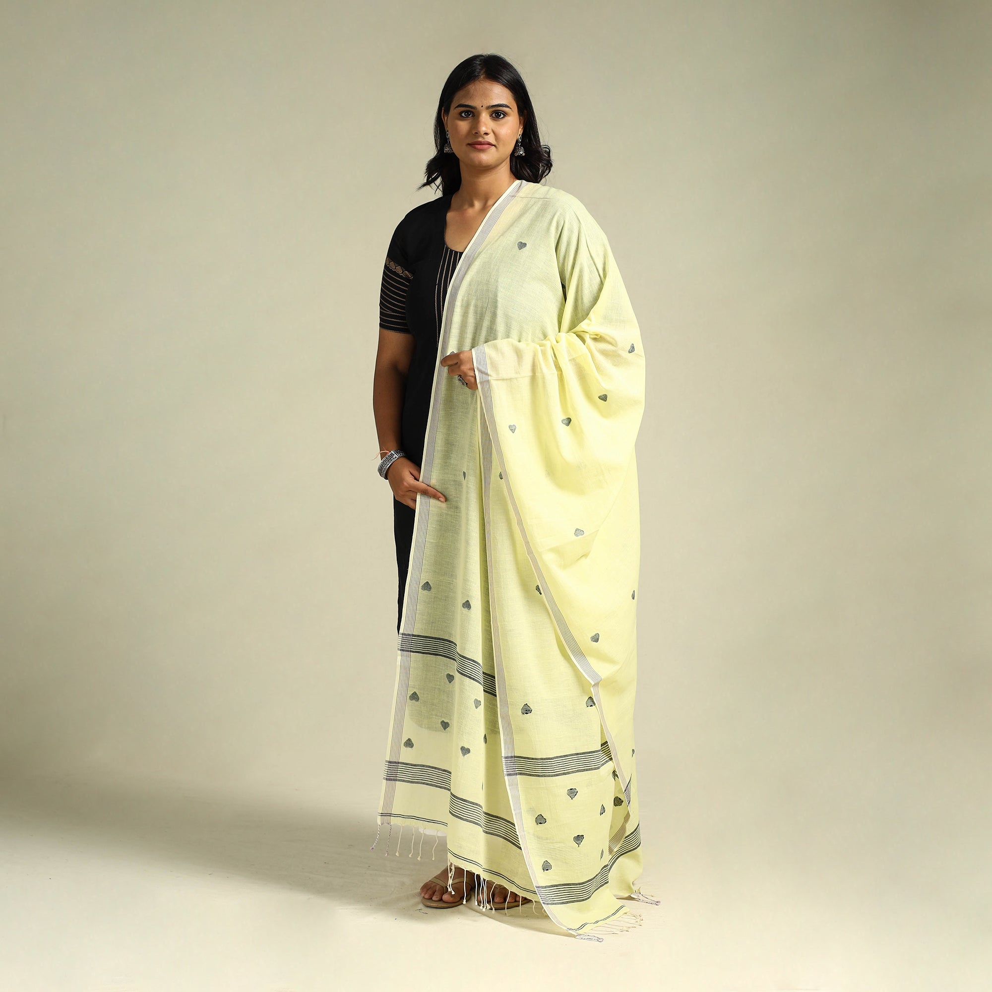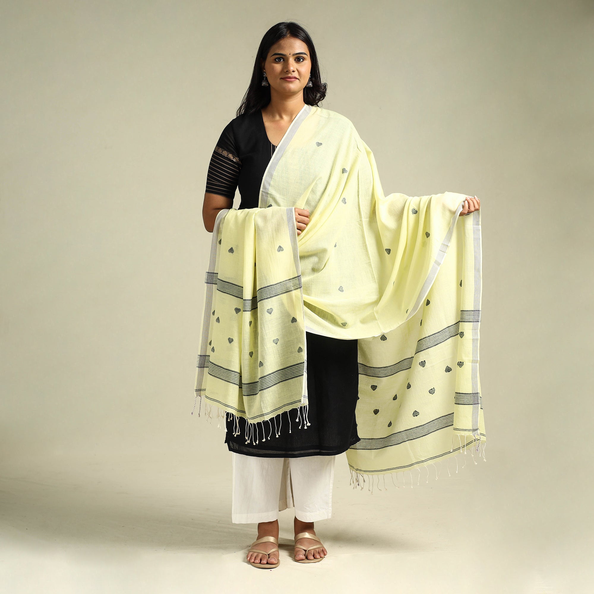 This yellow handloom cotton burdwan jamdani dupatta with tassels is crafted by skilled artisans of Bengal. Jamdani’s extra-weft weaving technique, creates delicate embroidery-like patterns directly on the loom. Using small shuttles of coloured threads passed through the warp, the weaving resembles intricate tapestry work. A perfect blend of tradition and charm, this lightweight dupatta is ideal for both special occasions and everyday wear.