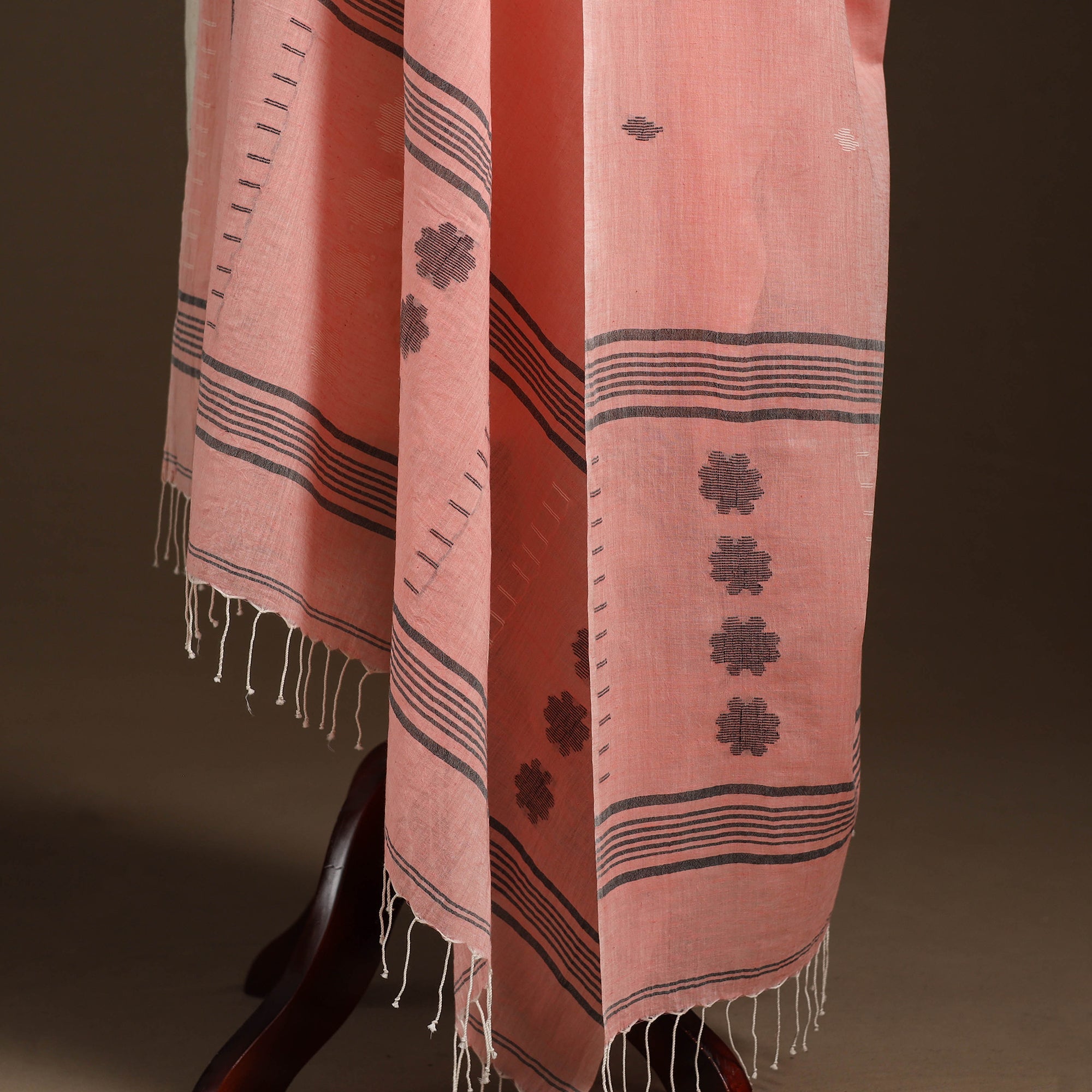 This pink handloom cotton burdwan jamdani dupatta with tassels is crafted by skilled artisans of Bengal. Jamdani’s is extra-weft weaving technique creates delicate embroidery-like patterns directly on the loom. Using small shuttles of coloured threads passed through the warp, the weaving resembles intricate tapestry work. A perfect blend of tradition and charm, this lightweight dupatta is ideal for both special occasions and everyday wear.