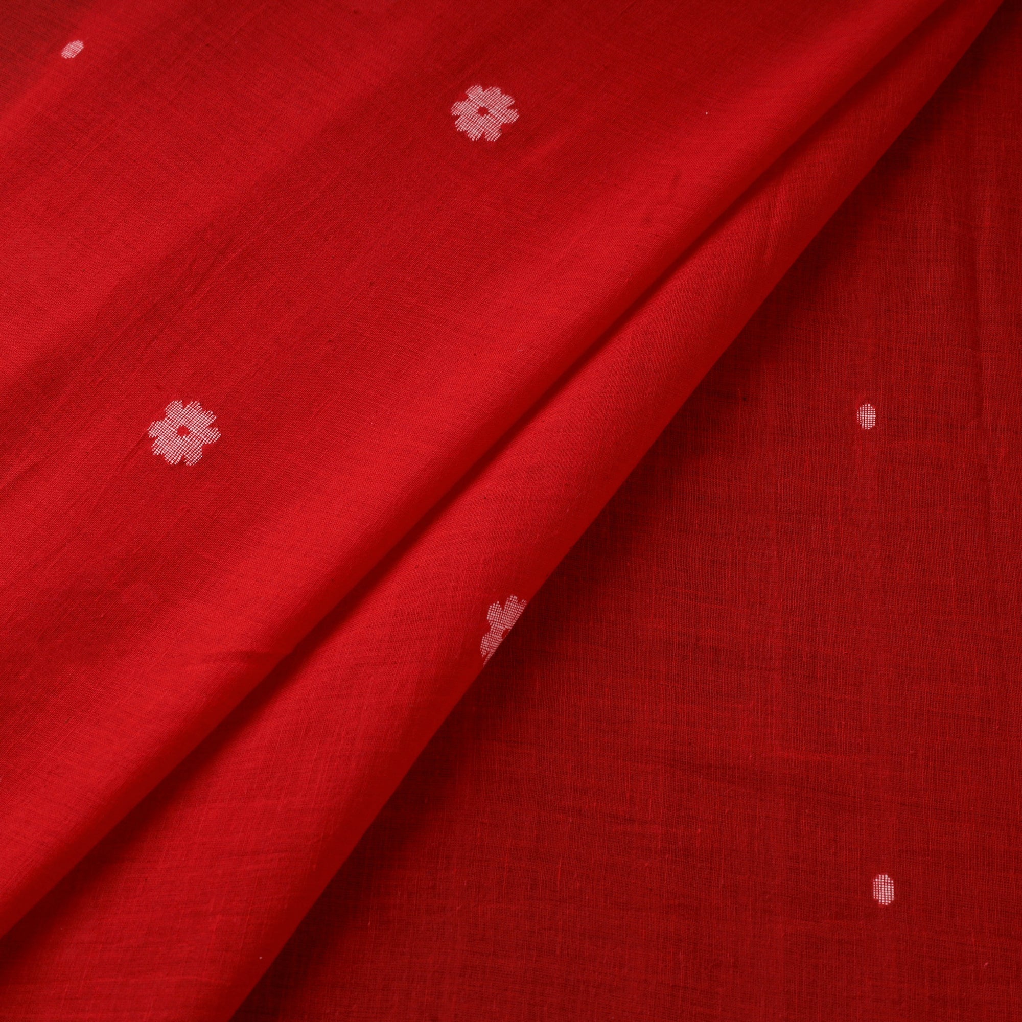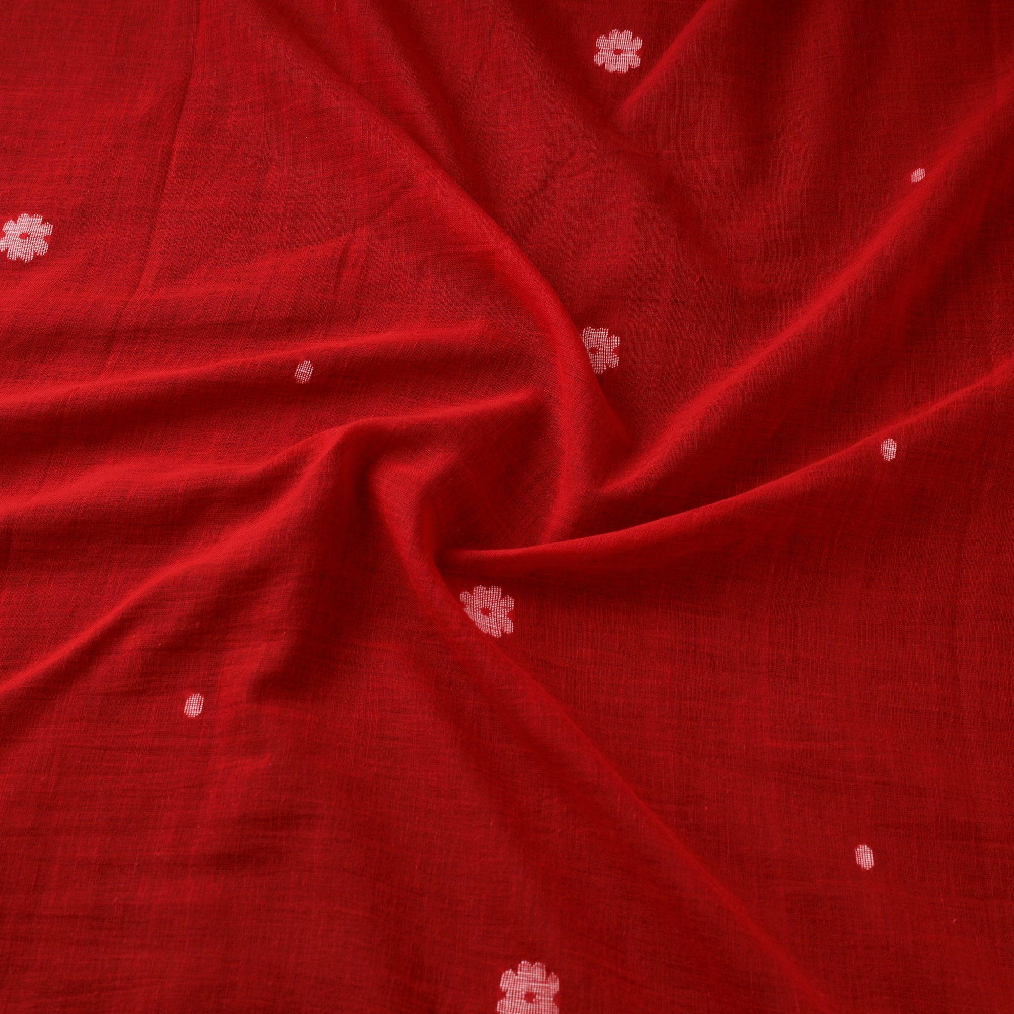 This red handloom cotton burdwan jamdani fabric is crafted by the skilled artisans of Bengal. The base fabric for Jamdani is made using unbleached cotton yarn, while the design is woven with bleached cotton yarns to create a subtle light-and-dark effect. The process is extremely time-consuming as it involves a tedious form of hand looming. This exquisite perfect for sarees, dupattas, kurtas, or elegant home decor, adding a touch of tradition to every creation.