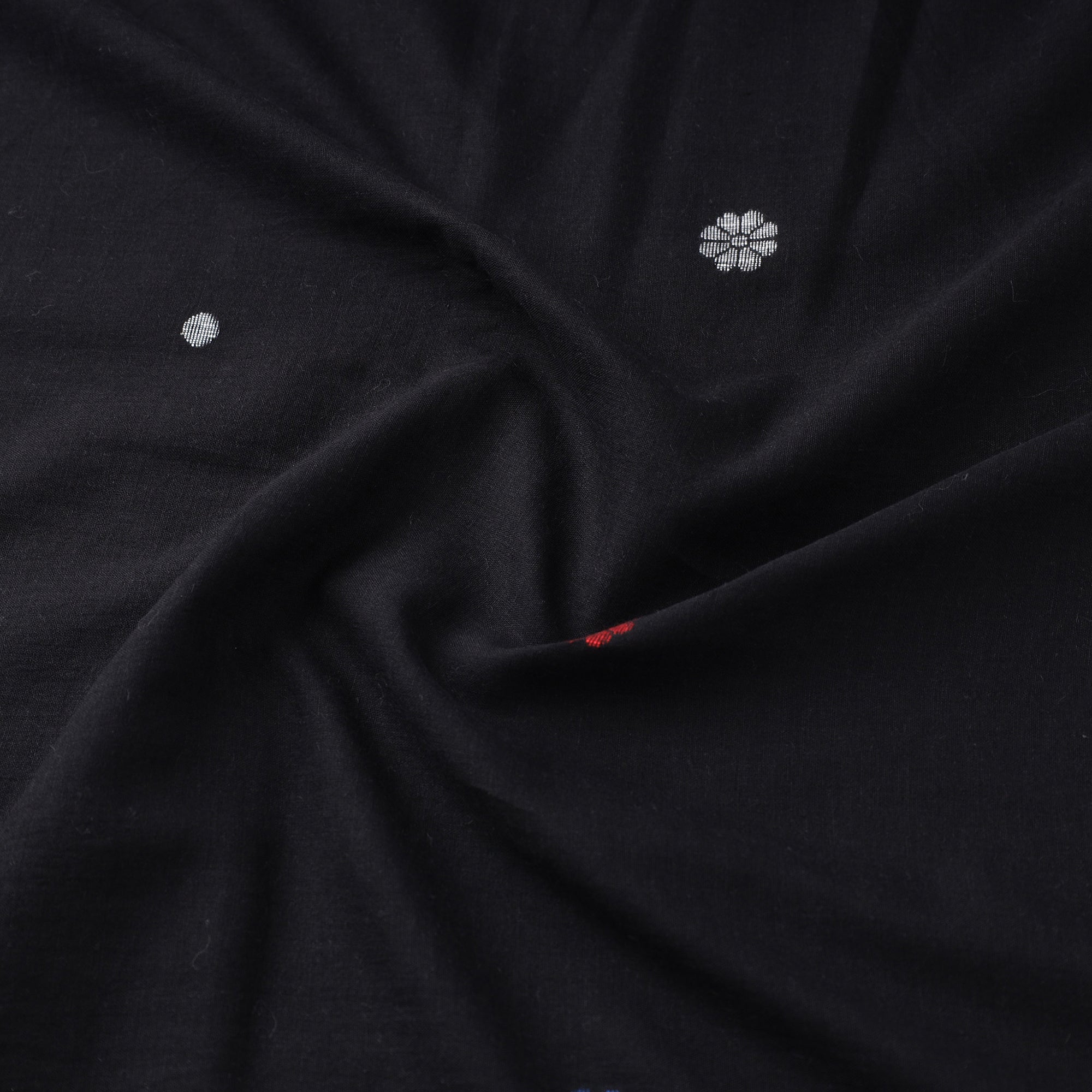 This black handloom cotton burdwan jamdani fabric is crafted by the skilled artisans of Bengal. The base fabric for Jamdani is made using unbleached cotton yarn, while the design is woven with bleached cotton yarns to create a subtle light-and-dark effect. The process is extremely time-consuming as it involves a tedious form of hand looming. This exquisite perfect for sarees, dupattas, kurtas, or elegant home decor, adding a touch of tradition to every creation.