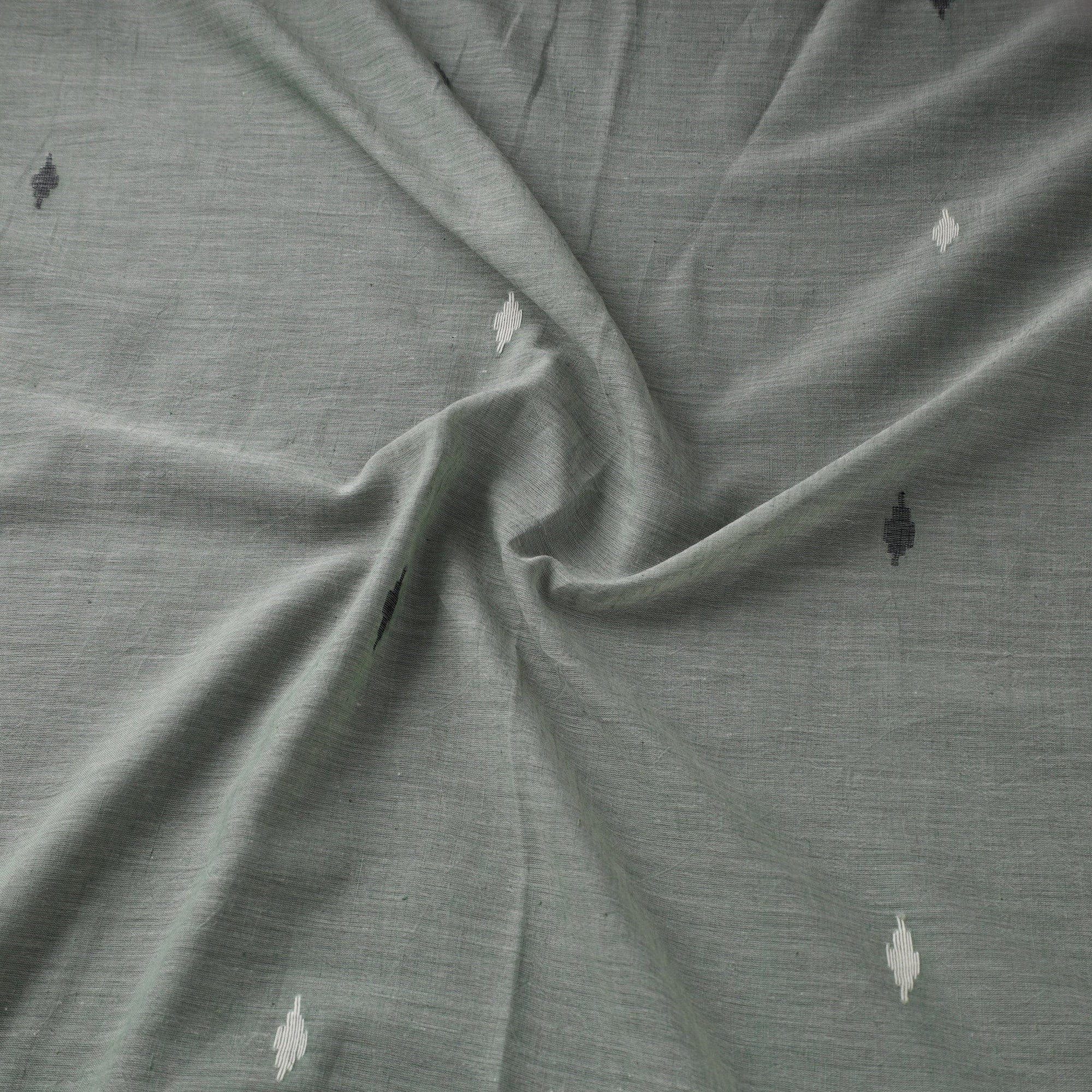 This green handloom cotton burdwan jamdani fabric is crafted by the skilled artisans of Bengal. The base fabric for Jamdani is made using unbleached cotton yarn, while the design is woven with bleached cotton yarns to create a subtle light-and-dark effect. The process is extremely time-consuming as it involves a tedious form of hand looming. This exquisite perfect for sarees, dupattas, kurtas, or elegant home decor, adding a touch of tradition to every creation.