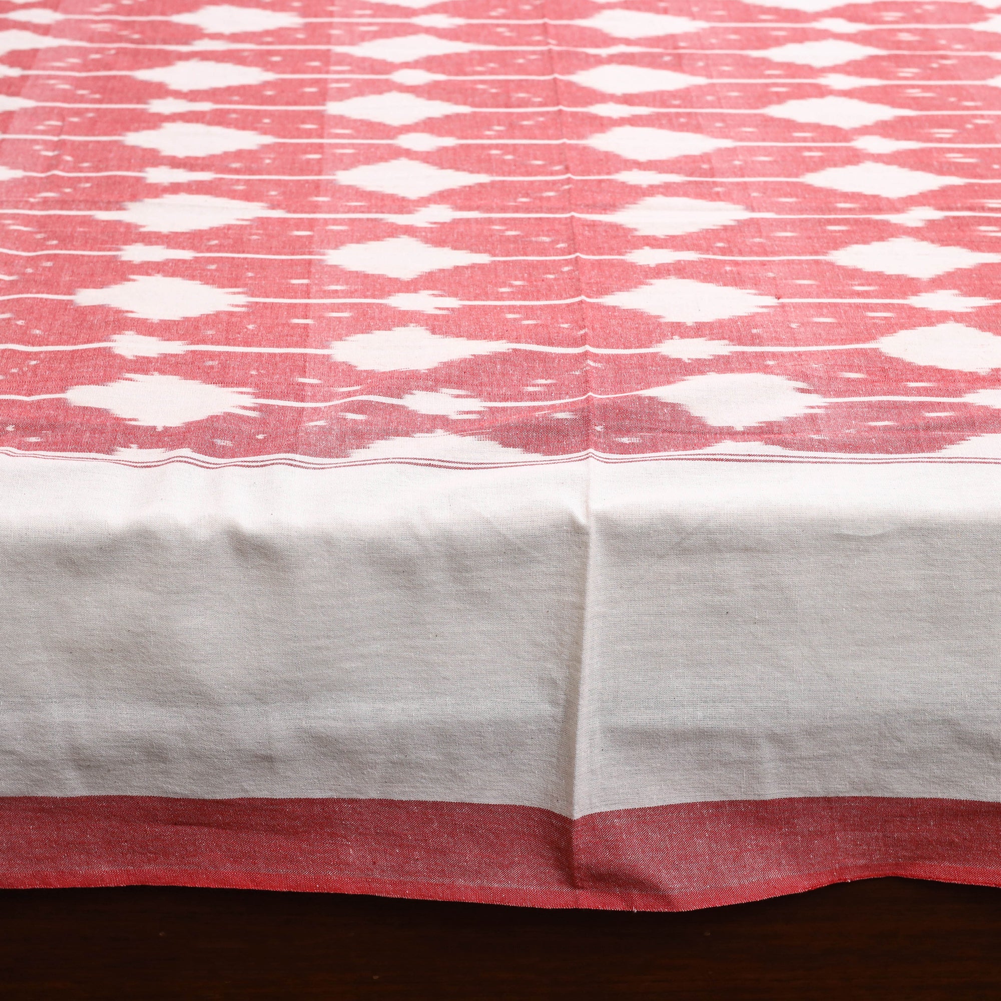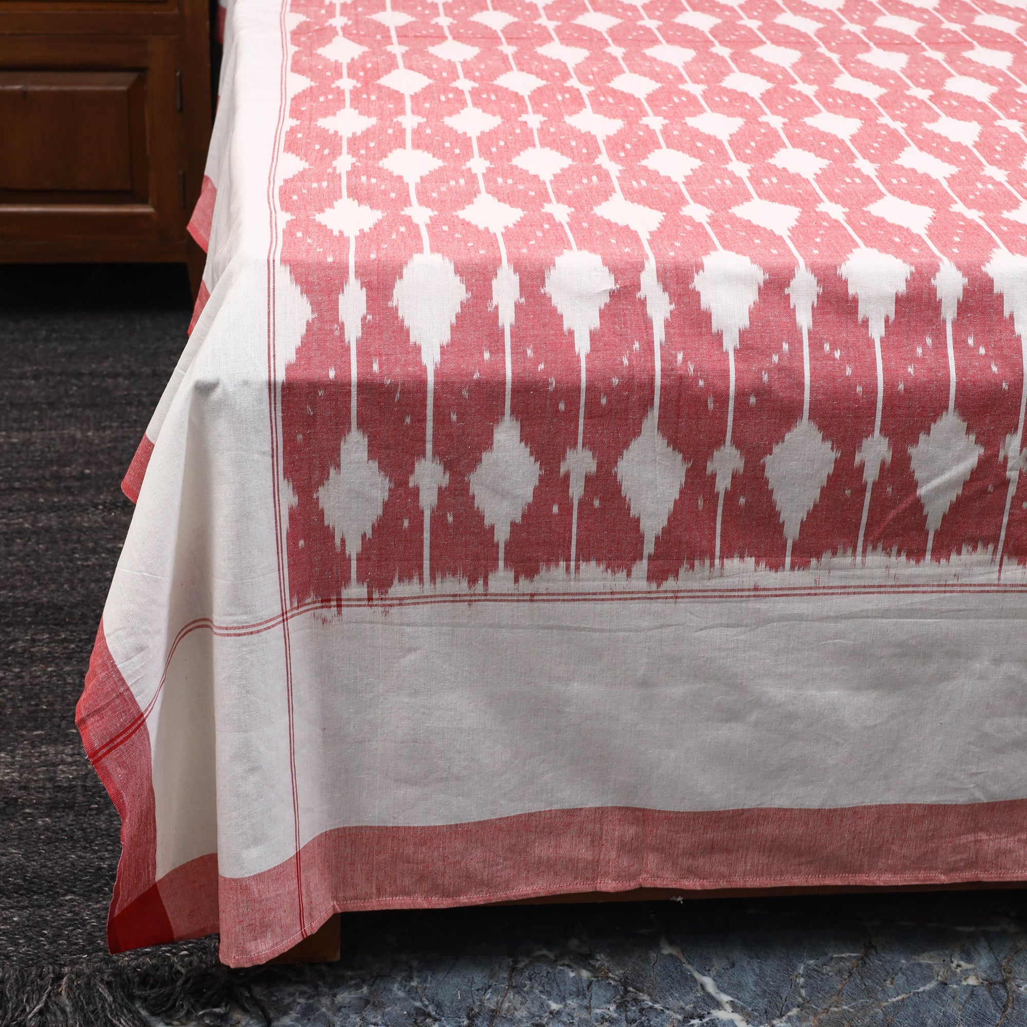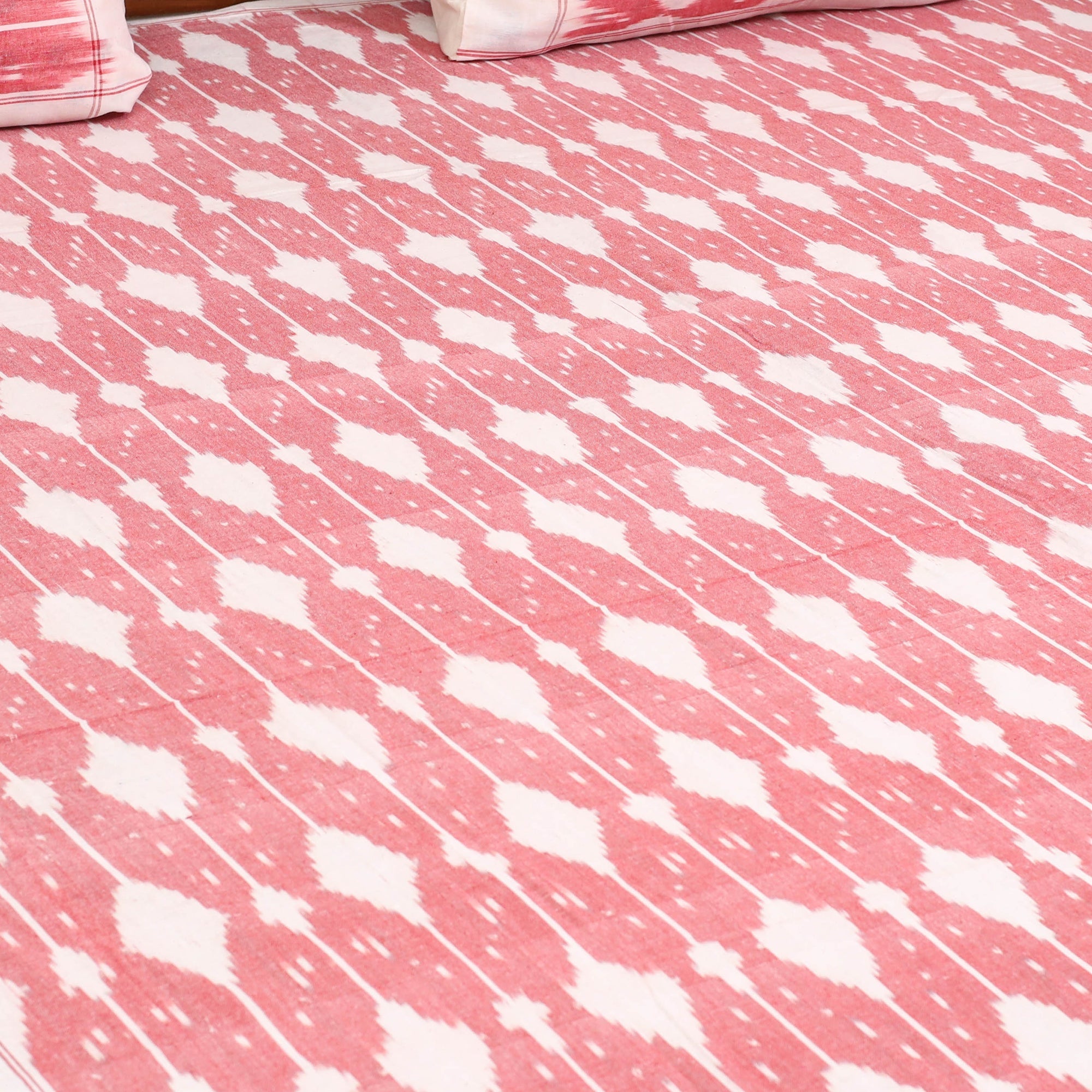 Handloom cotton pochampally ikat bed sheet set, crafted by skilled artisans. The ikat technique involves resist dyeing the yarns before weaving, which creates intricate and unique patterns. This double bed sheet set includes matching pillow covers for a coordinated and complete look.