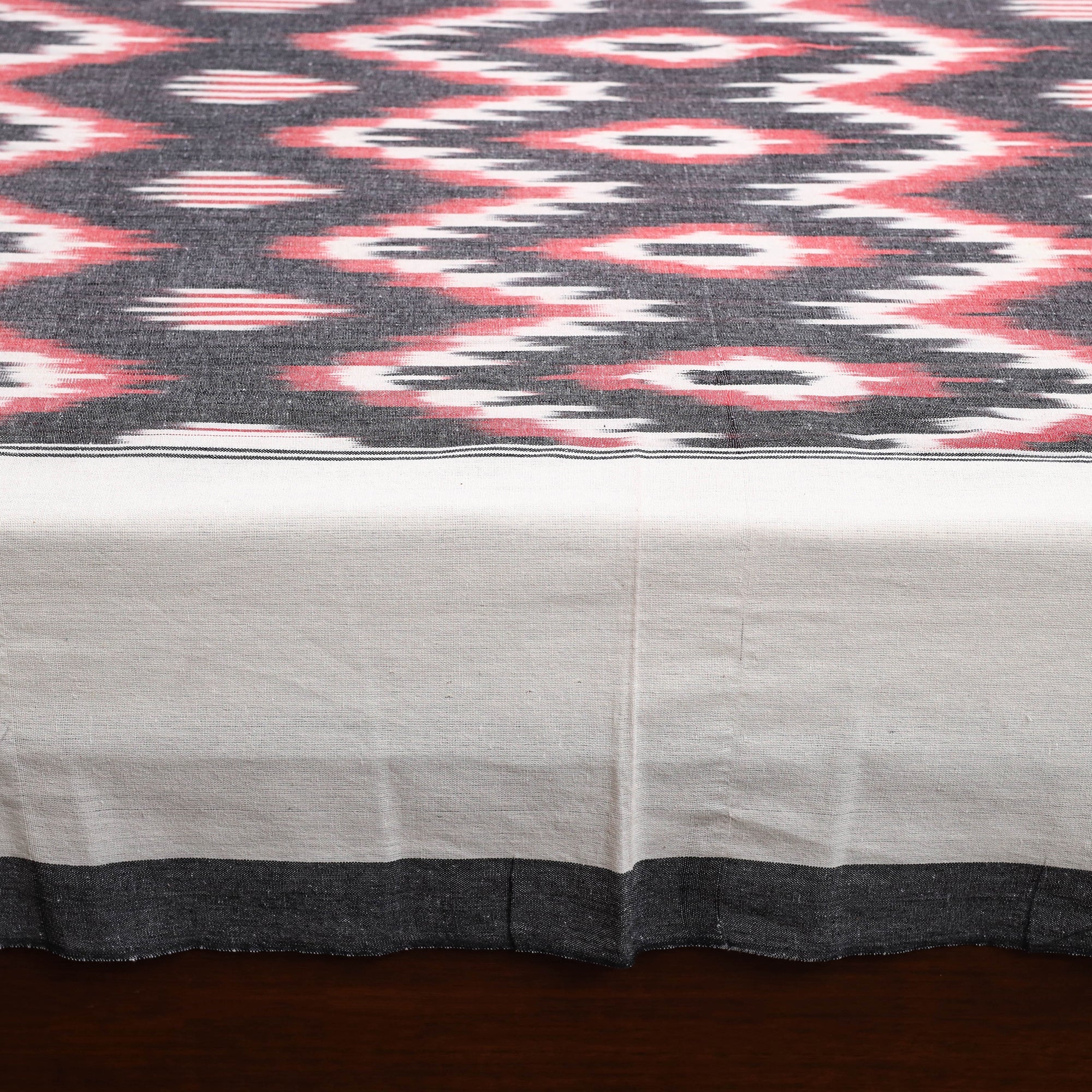 Handloom cotton pochampally ikat bed sheet set, crafted by skilled artisans. The ikat technique involves resist dyeing the yarns before weaving, which creates intricate and unique patterns. This double bed sheet set includes matching pillow covers for a coordinated and complete look.