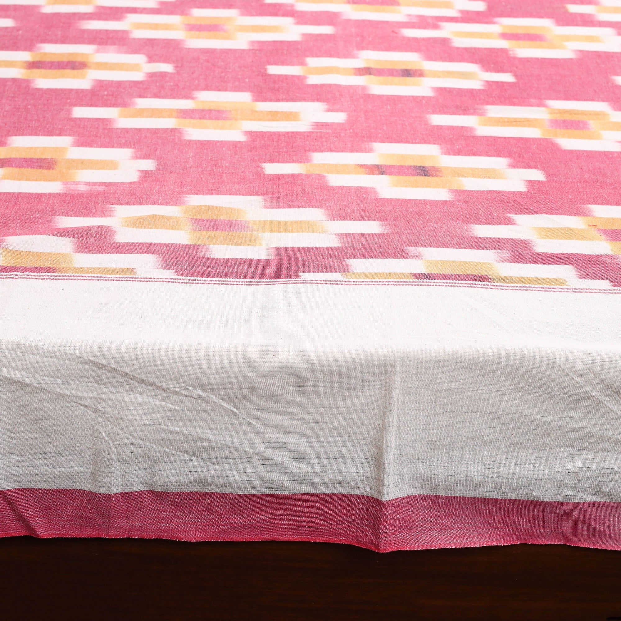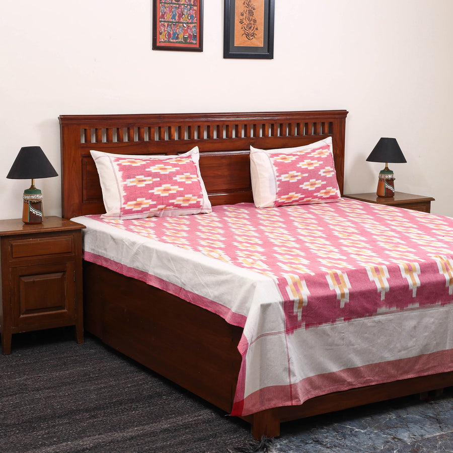 Handloom cotton pochampally ikat bed sheet set, crafted by skilled artisans. The ikat technique involves resist dyeing the yarns before weaving, which creates intricate and unique patterns. This double bed sheet set includes matching pillow covers for a coordinated and complete look.