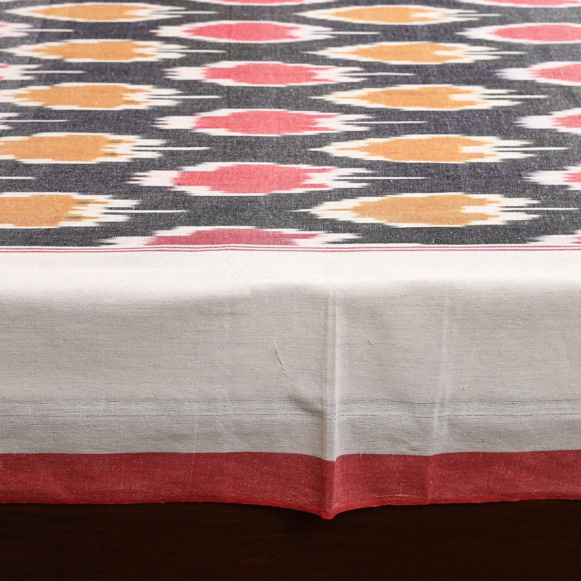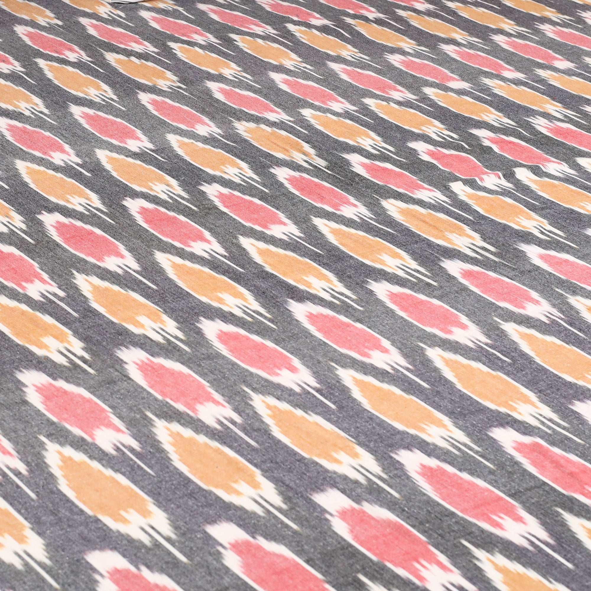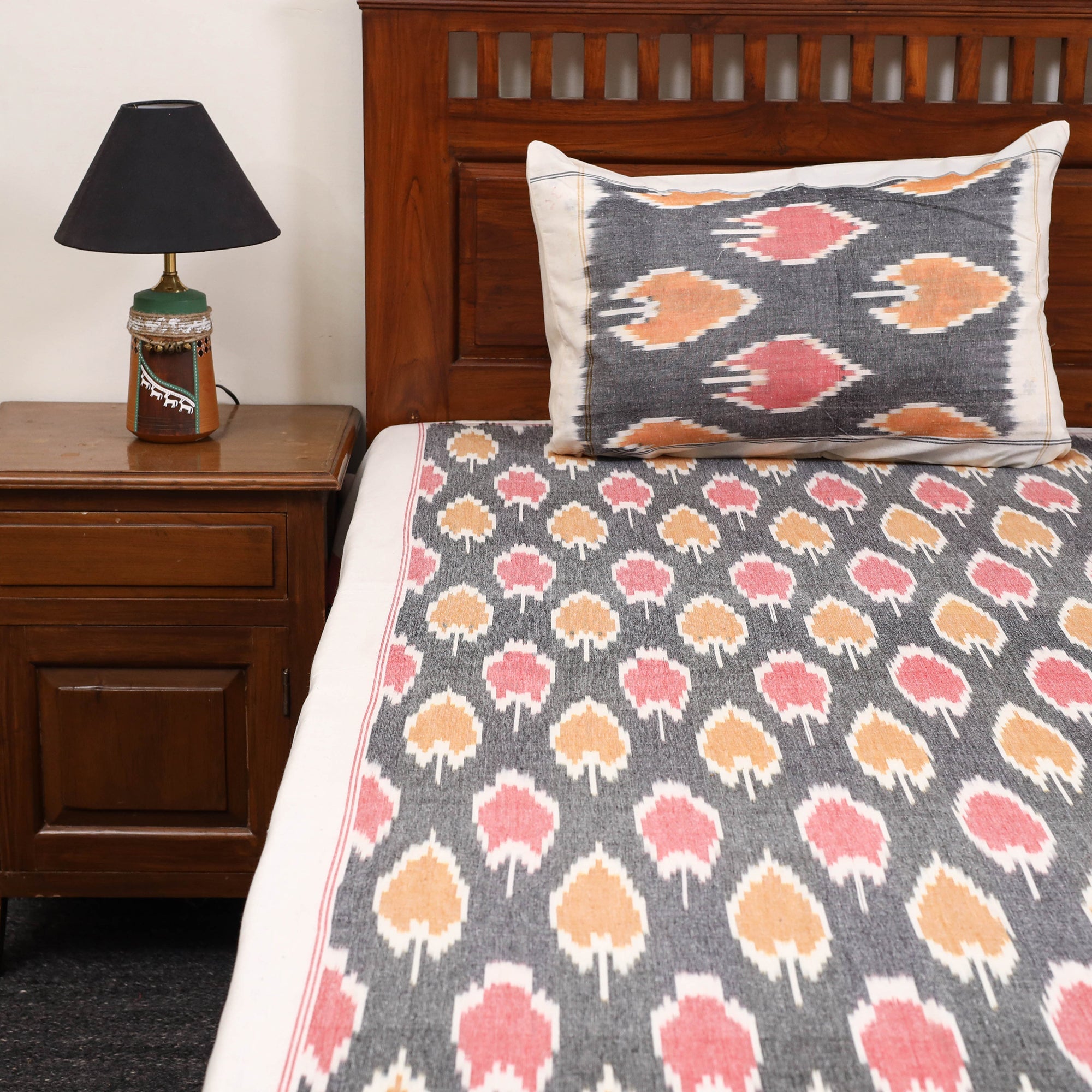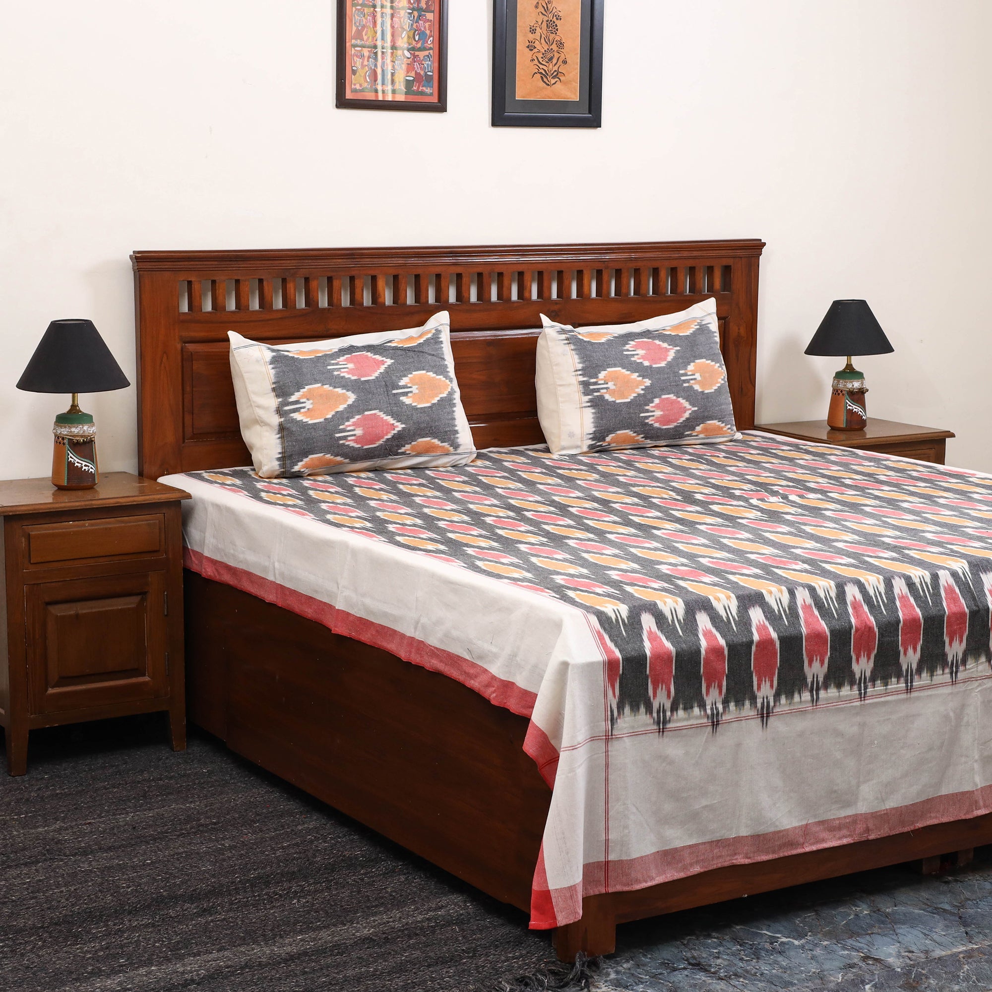 Handloom cotton pochampally ikat bed sheet set, crafted by skilled artisans. The ikat technique involves resist dyeing the yarns before weaving, which creates intricate and unique patterns. This double bed sheet set includes matching pillow covers for a coordinated and complete look.