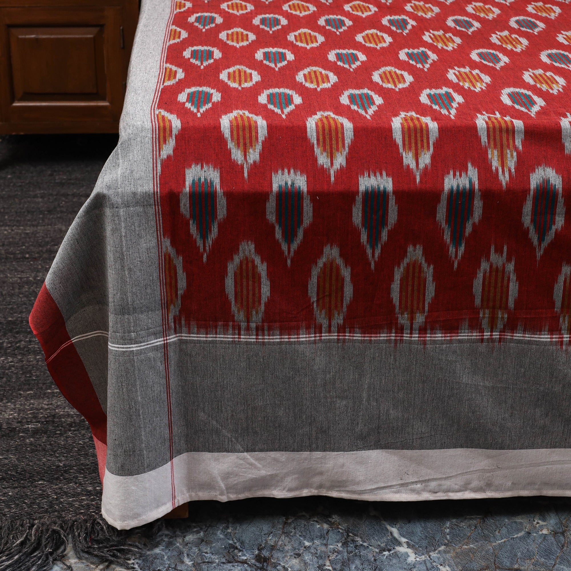 Handloom cotton pochampally ikat bed sheet set, crafted by skilled artisans. The ikat technique involves resist dyeing the yarns before weaving, which creates intricate and unique patterns. This double bed sheet set includes matching pillow covers for a coordinated and complete look.