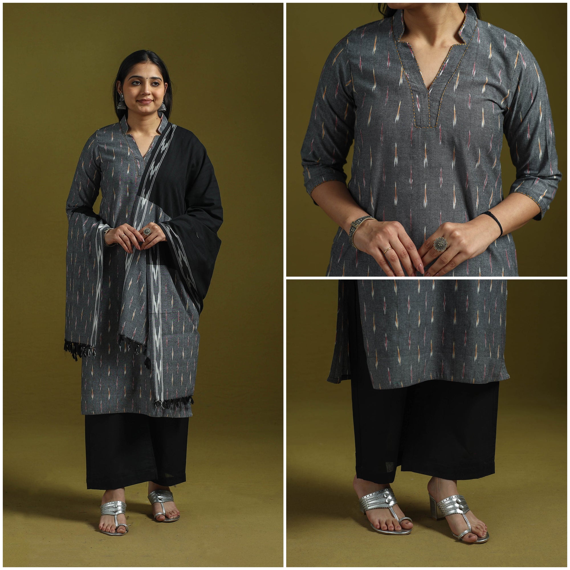 Handloom cotton hand embroidered pochampally ikat 3pc kurta set. It features comfortable straight kurta with side pocket a plain palazzo with two side pockets and elasticated waistband and matching dupatta. The Ikat technique in which yarns are resist dyed before weaving creates intricate patterns.