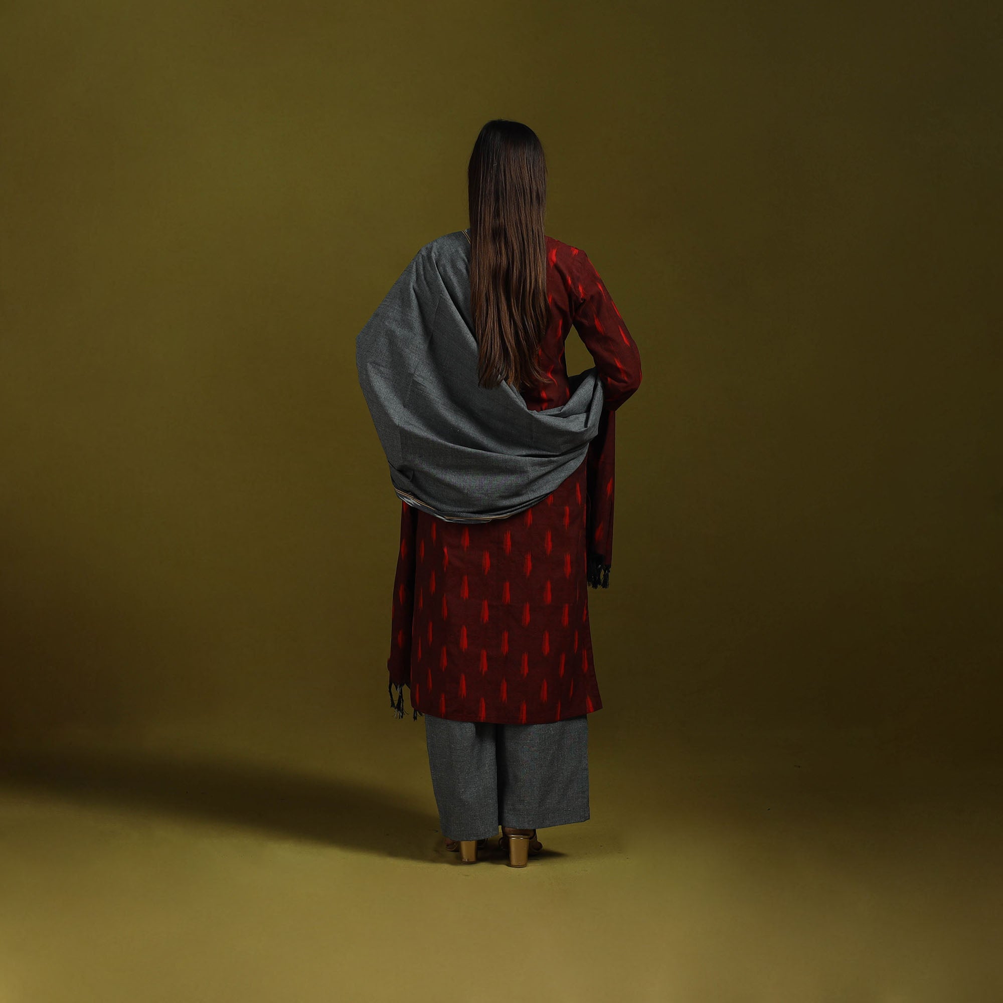 | Material | handloom cotton hand embroidered pochampally ikat 3pc kurta set. It features comfortable straight kurta with side pocket a plain palazzo with two side pockets and elasticated waistband and matching dupatta. The Ikat technique in which yarns are resist dyed before weaving creates intricate patterns. Note: This piece carries tiny knots, thread pulls or uneven lines not flaws but fingerprints. Every irregularity is a whisper from the hands that made it. It’s what happens when tradition weaves through time not machines. If you’re looking for perfection, this isn’t it. But if you’re looking for soul you’ve found it. |