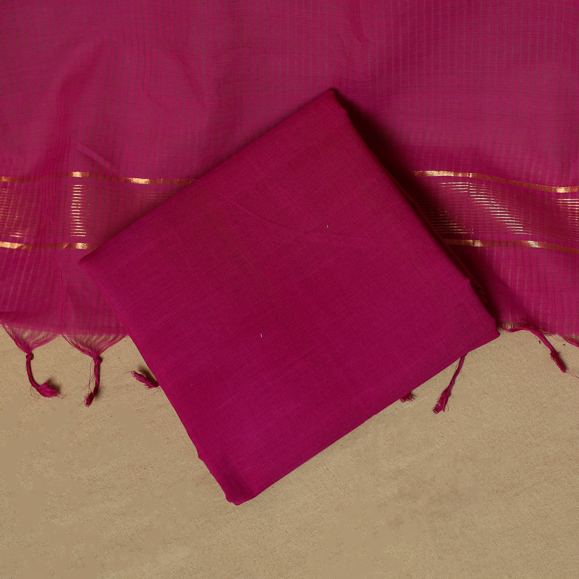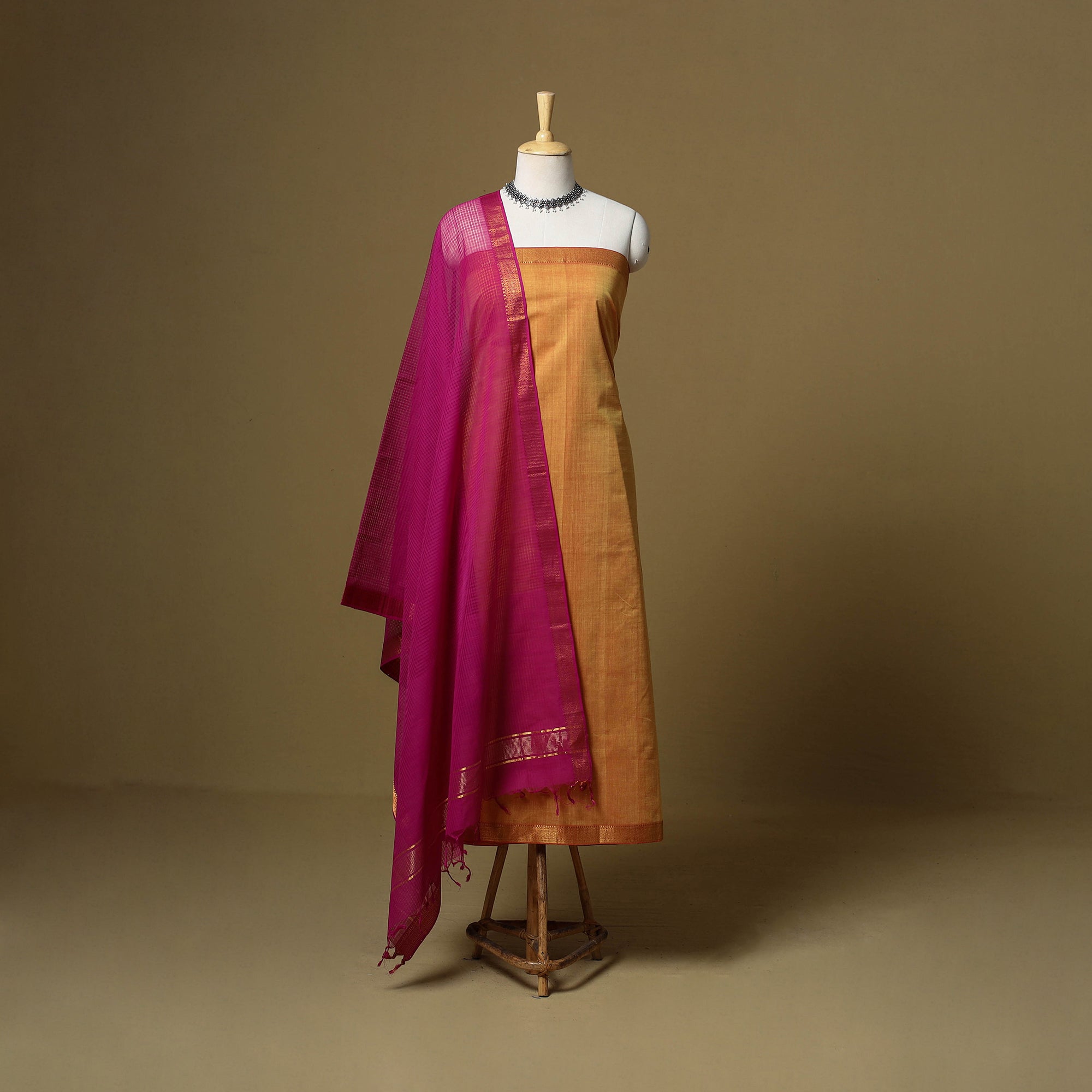 3pc original mangalagiri handloom cotton unstitched dress material set from Andhra Pradesh. Woven using the traditional mangalagiri technique known for its fine texture and nizam zari borders, this set beautifully blends simplicity with elegance. It includes a kurta, a matching plain bottom, and a missing checks dupatta. Perfect for festive occasions or effortless everyday styling.