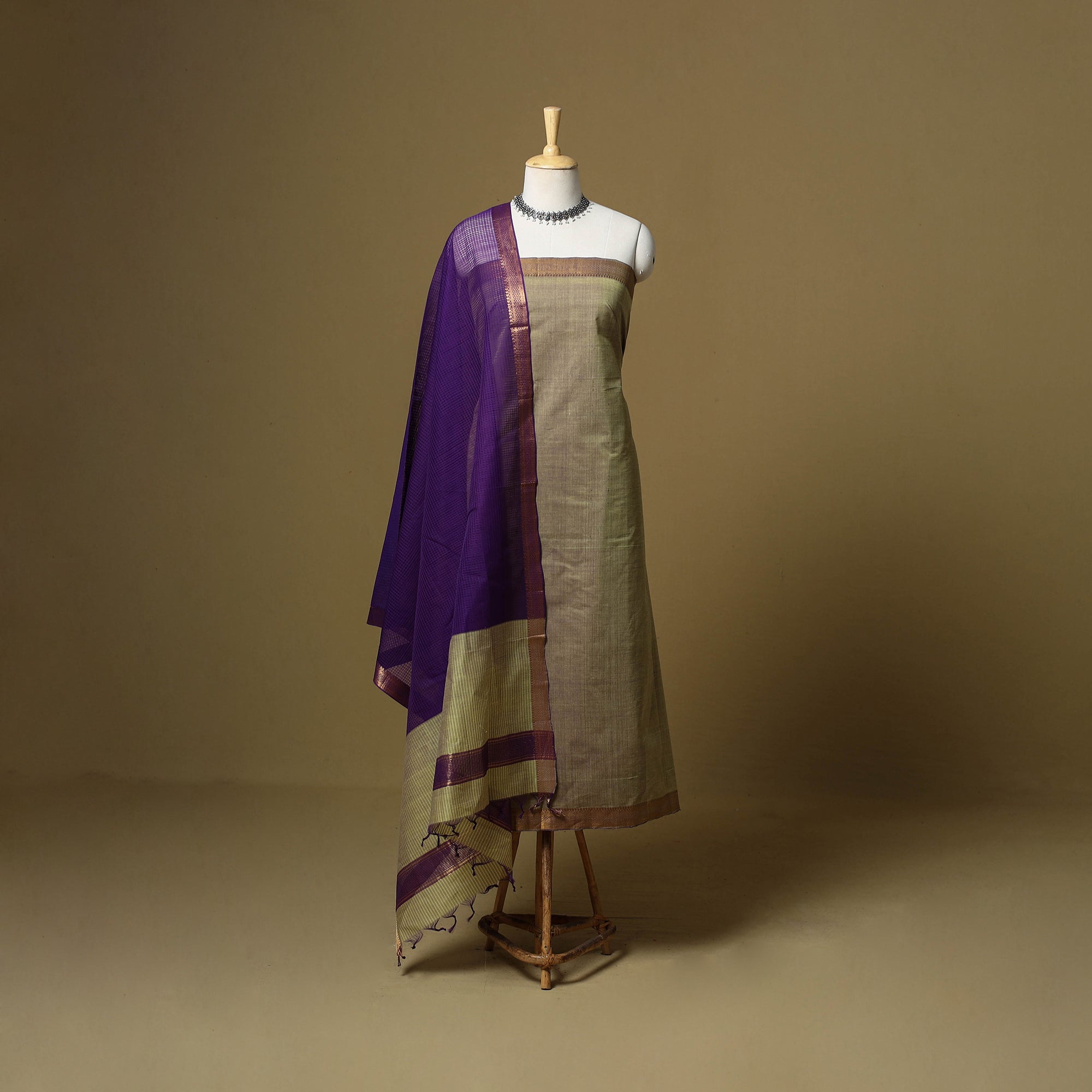 Green 3pc original mangalagiri handloom cotton unstitched dress material set from Andhra Pradesh. Woven using the traditional mangalagiri technique known for its fine texture and nizam zari borders, this set beautifully blends simplicity with elegance. It includes a kurta, a matching plain bottom, and a missing checks dupatta. Perfect for festive occasions or effortless everyday styling.
