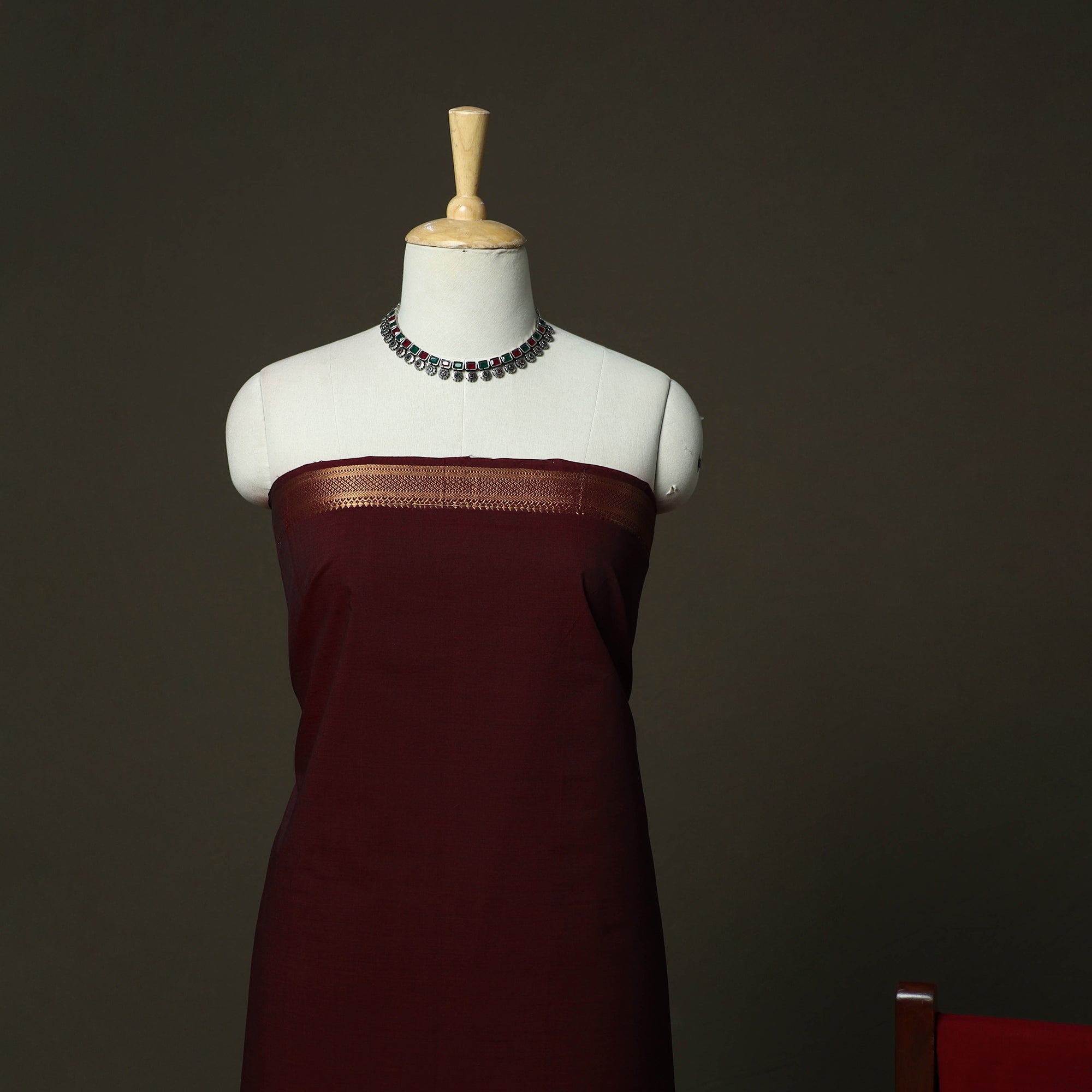 | Material | Maroon mangalagiri handloom 3pc unstitched dress material set originates from Andhra Pradesh, where the mangalagiri weaving tradition has been practiced for over 500 years in the Guntur district. Woven on traditional pit looms, this cotton fabric is known for its fine texture, durability and clean finish. The kurta fabric features nizam zari border, paired with a matching plain bottom and a missing checks dupatta. Comfortable to wear and easy to style, this unstitched set works well for festive occasions, cultural gatherings or refined everyday wear. |