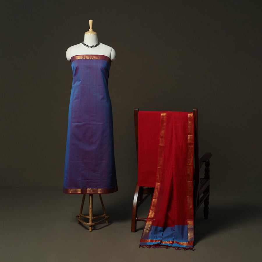 Purple mangalagiri handloom 3pc unstitched dress material set originates from Andhra Pradesh, where the mangalagiri weaving tradition has been practiced for over 500 years in the Guntur district. Woven on traditional pit looms, this cotton fabric is known for its fine texture, durability and clean finish. The kurta fabric features nizam zari border, paired with a matching plain bottom and a missing checks dupatta. Comfortable to wear and easy to style, this unstitched set works well for festive occasions, cultural gatherings or refined everyday wear.