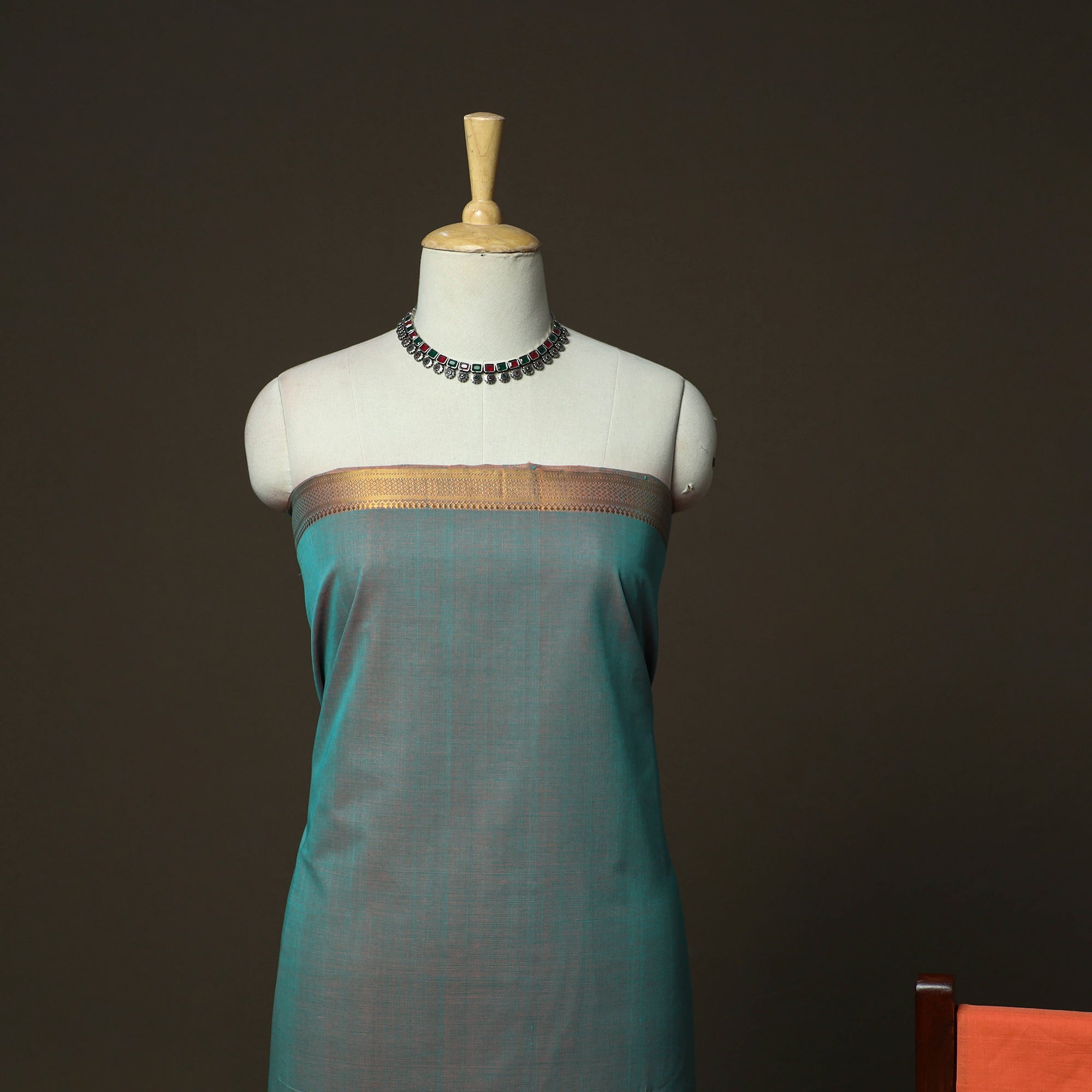 Green mangalagiri handloom 3pc unstitched dress material set originates from Andhra Pradesh, where the mangalagiri weaving tradition has been practiced for over 500 years in the Guntur district. Woven on traditional pit looms, this cotton fabric is known for its fine texture, durability and clean finish. The kurta fabric features nizam zari border, paired with a matching plain bottom and a missing checks dupatta. Comfortable to wear and easy to style, this unstitched set works well for festive occasions, cultural gatherings or refined everyday wear.