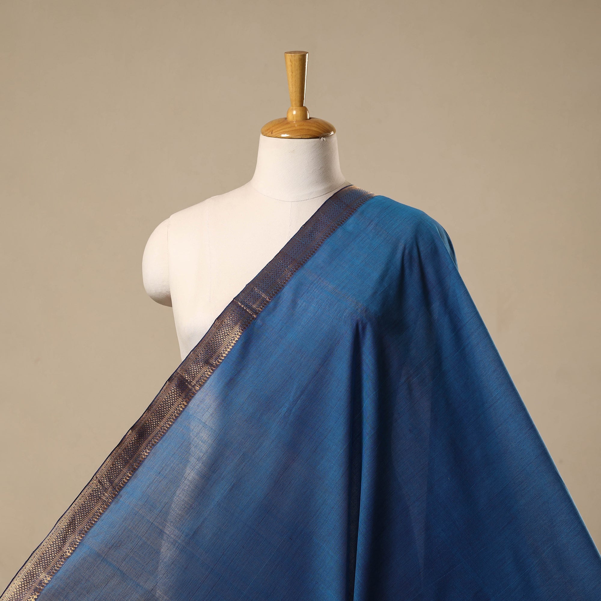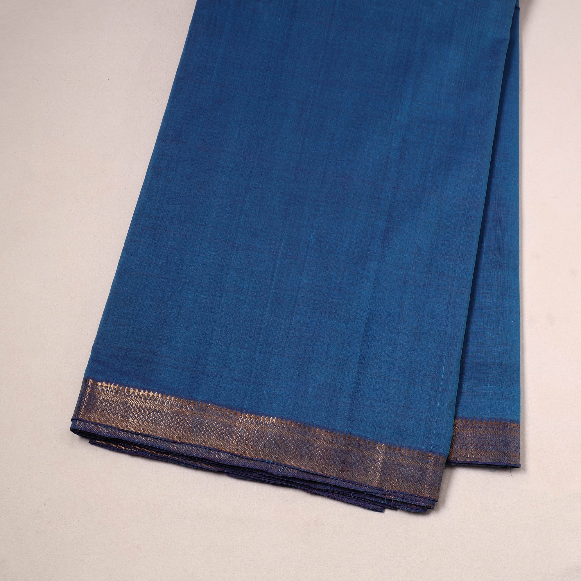 Blue mangalagiri handloom cotton fabric from Andhra Pradesh feels soft and comfortable, as the yarn is gently woven by hand. It keeps you cool in summer and warm in winter. The fabric is durable, easy to work with and suitable for everyday wear. Both sides feature a zari border, making it ideal for suits, kurtas, festive outfits and even home decor projects.