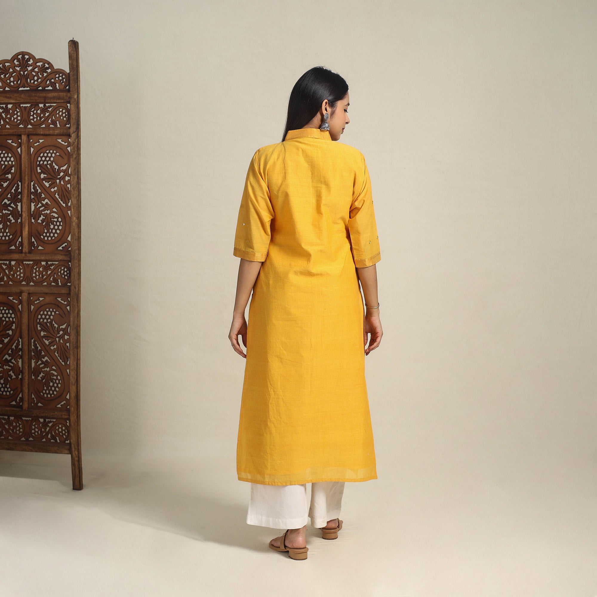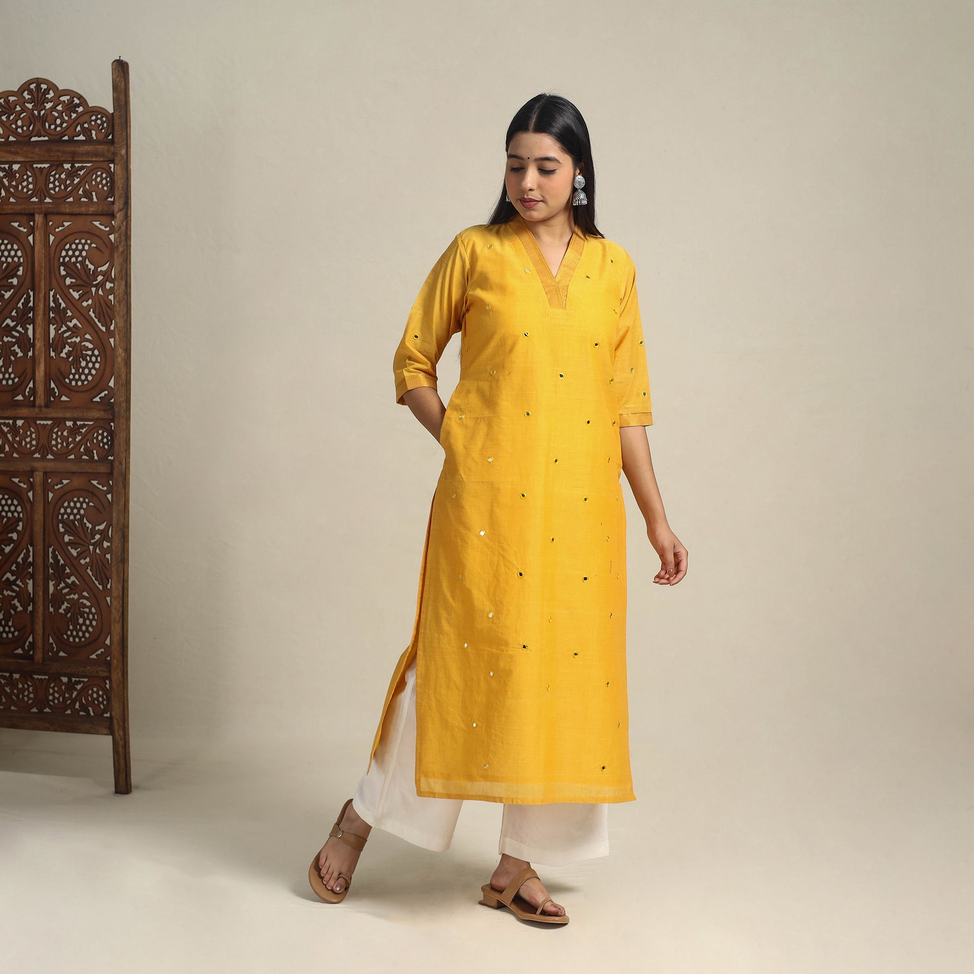 Step into timeless elegance with this handloom yellow straight mangalagiri kurta, crafted from breathable cotton and highlighted by fine mirror detailing. It’s tailored for ease with a handy side pocket, making it suitable for both special gatherings and casual outings.