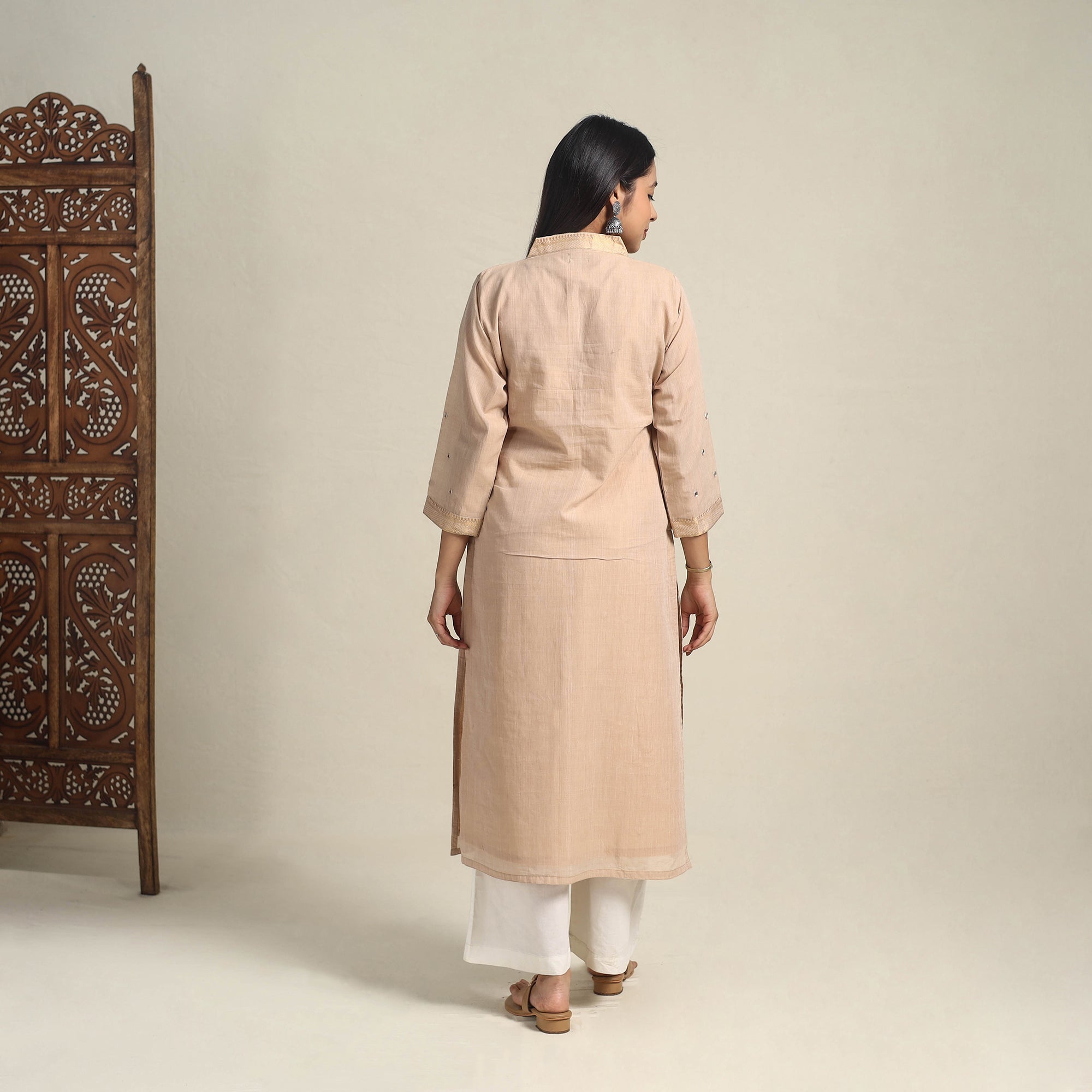 Step into timeless elegance with this beige handloom straight mangalagiri kurta, crafted from breathable cotton and highlighted by fine mirror detailing. It’s tailored for ease with a handy side pocket, making it suitable for both special gatherings and casual outings.