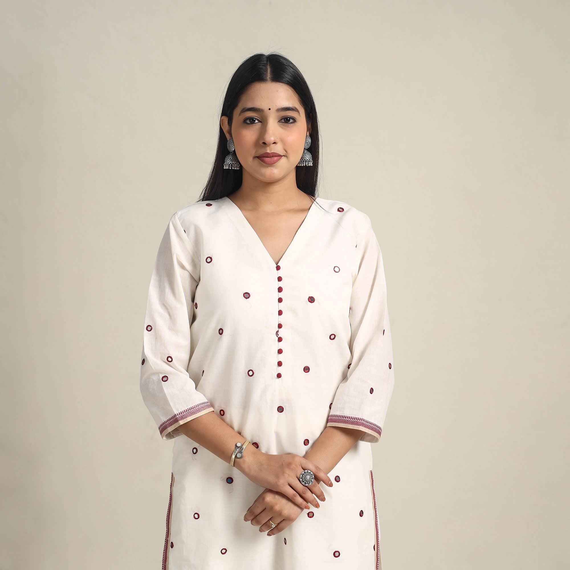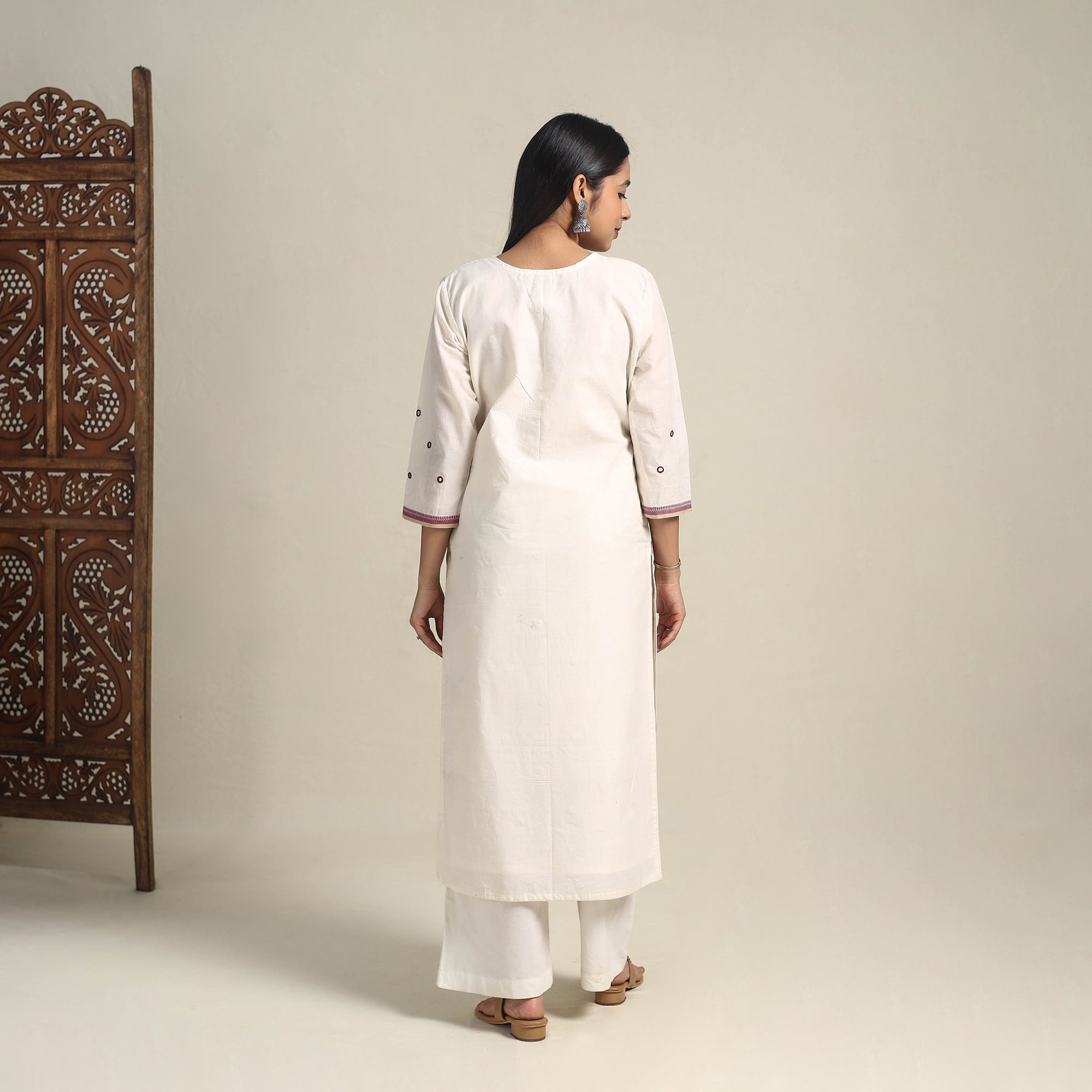 Step into timeless elegance with this handloom white straight mangalagiri kurta, crafted from breathable cotton and highlighted by fine mirror detailing. It’s tailored for ease with a handy side pocket, making it suitable for both special gatherings and casual outings.