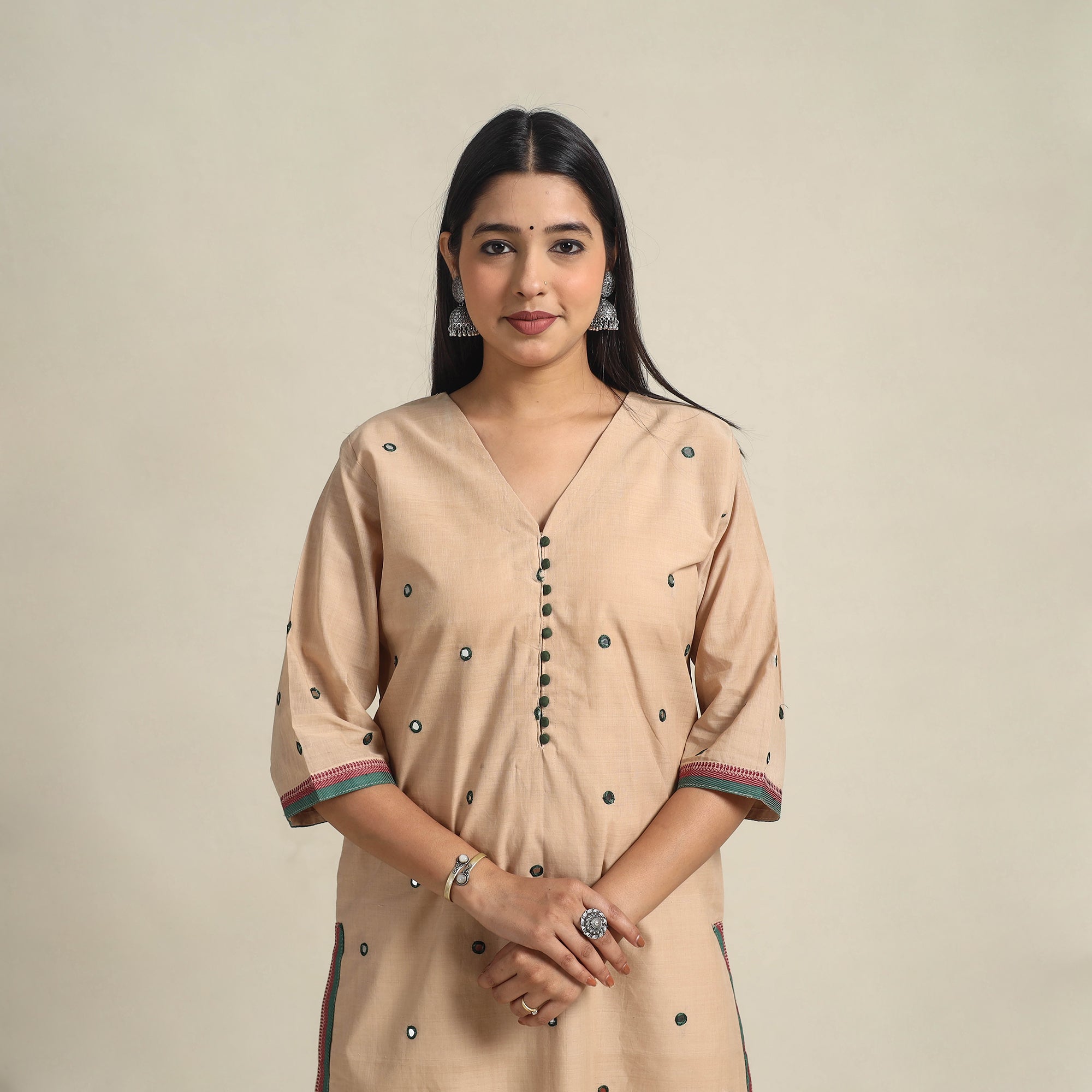 Step into timeless elegance with this handloom beige straight mangalagiri kurta, crafted from breathable cotton and highlighted by fine mirror detailing. It’s tailored for ease with a handy side pocket, making it suitable for both special gatherings and casual outings.