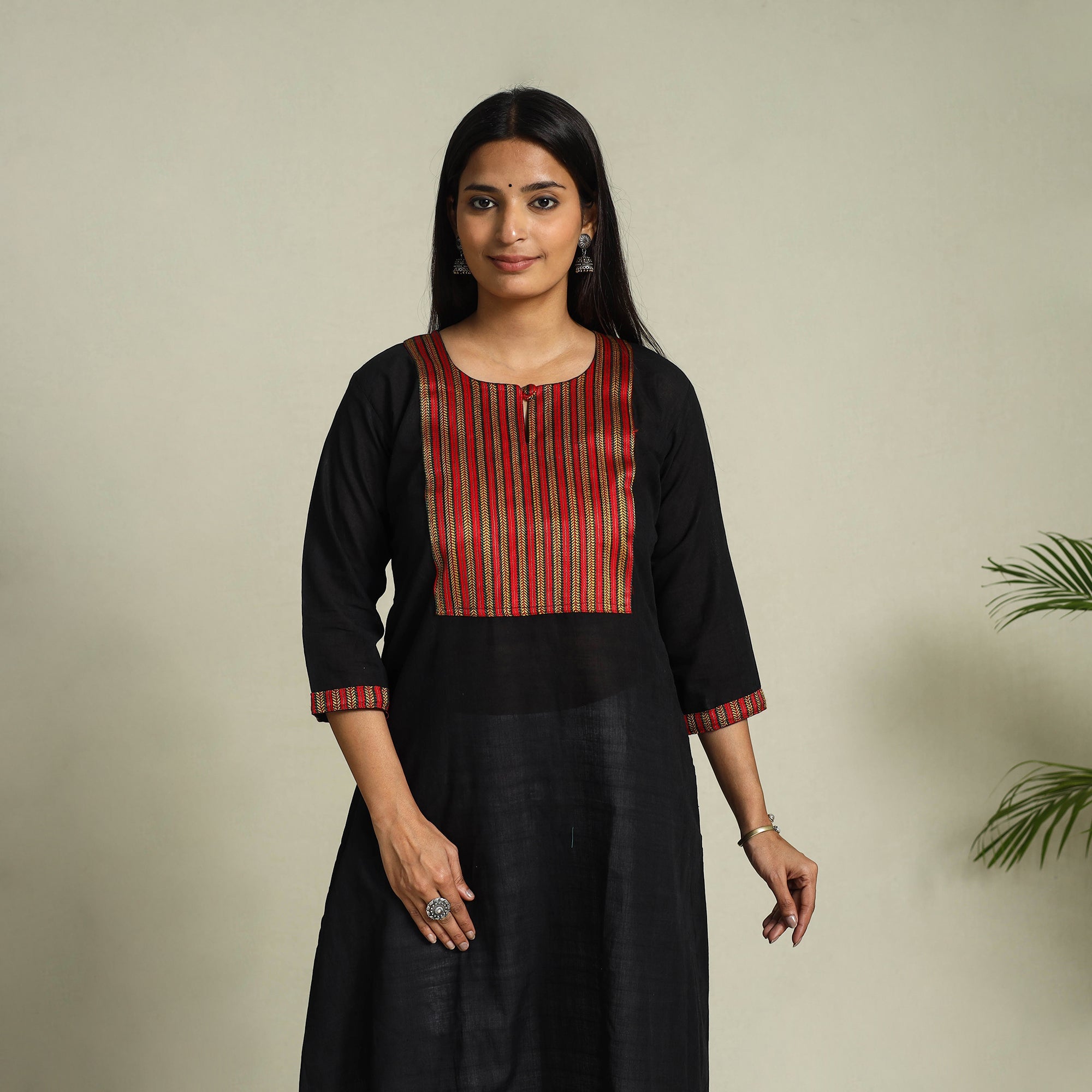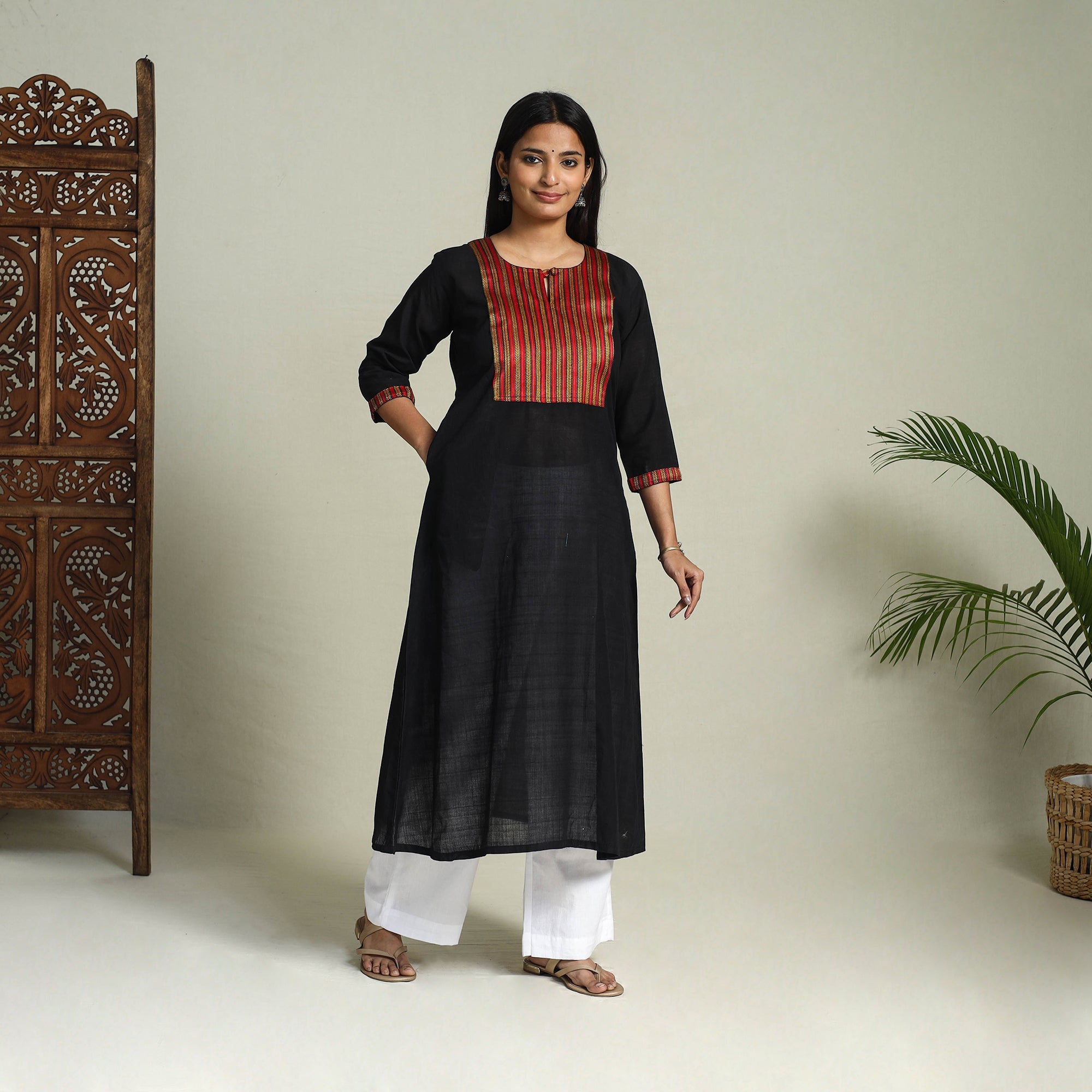 Look graceful in this black handloom cotton A-line mangalagiri kurta featuring elegant mashru silk patchwork. Made from breathable cotton, it ensures all-day comfort. Designed with a handy side pocket, it blends style and function. Perfect for both casual and festive occasions.