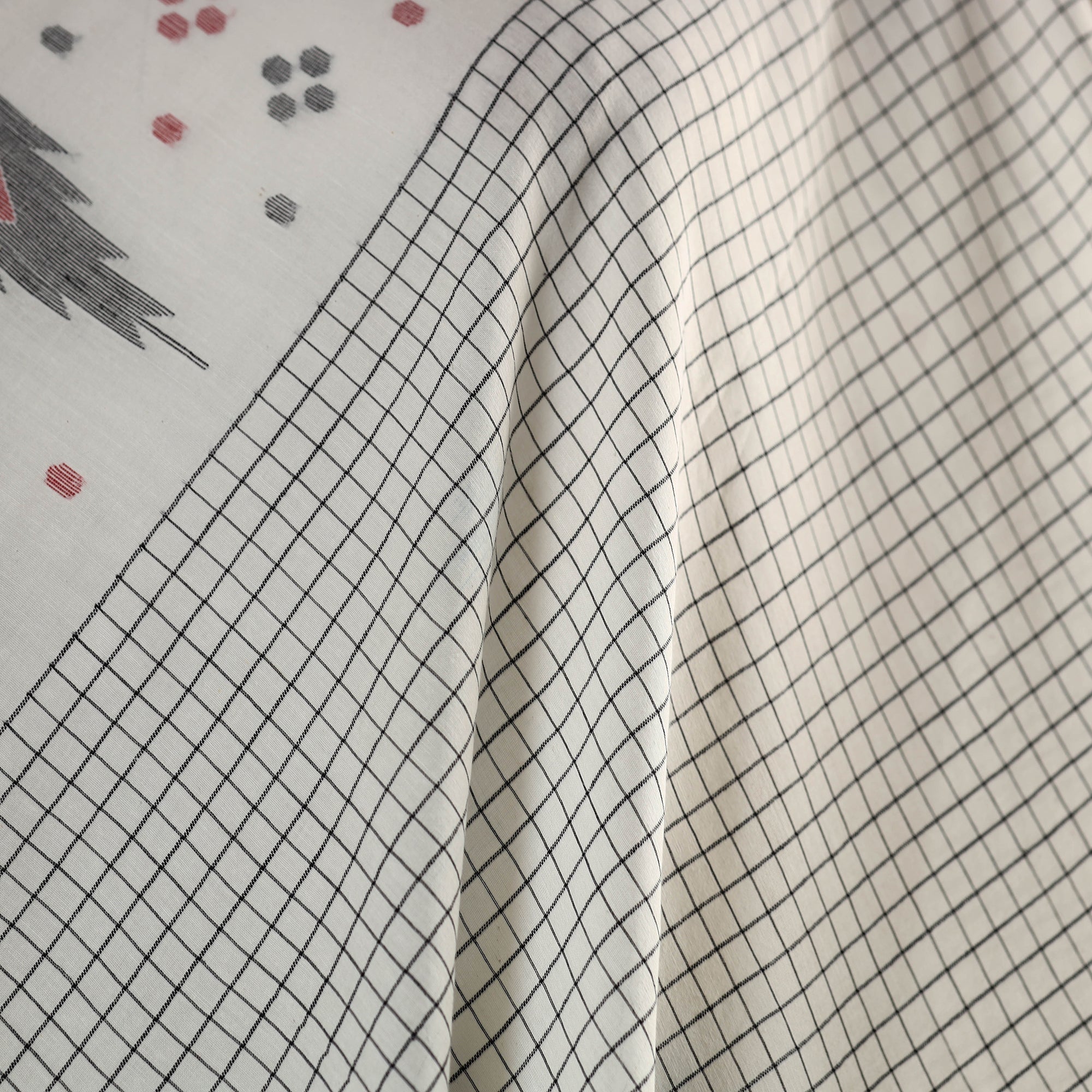 Width - 123 cm, Warp : 92, Weft : 40, GSM : 100 Gram. Transparency 0%, Shrinkage: 0%. Medium fine density jamdani cotton fabric suitable for all clothing purpose.