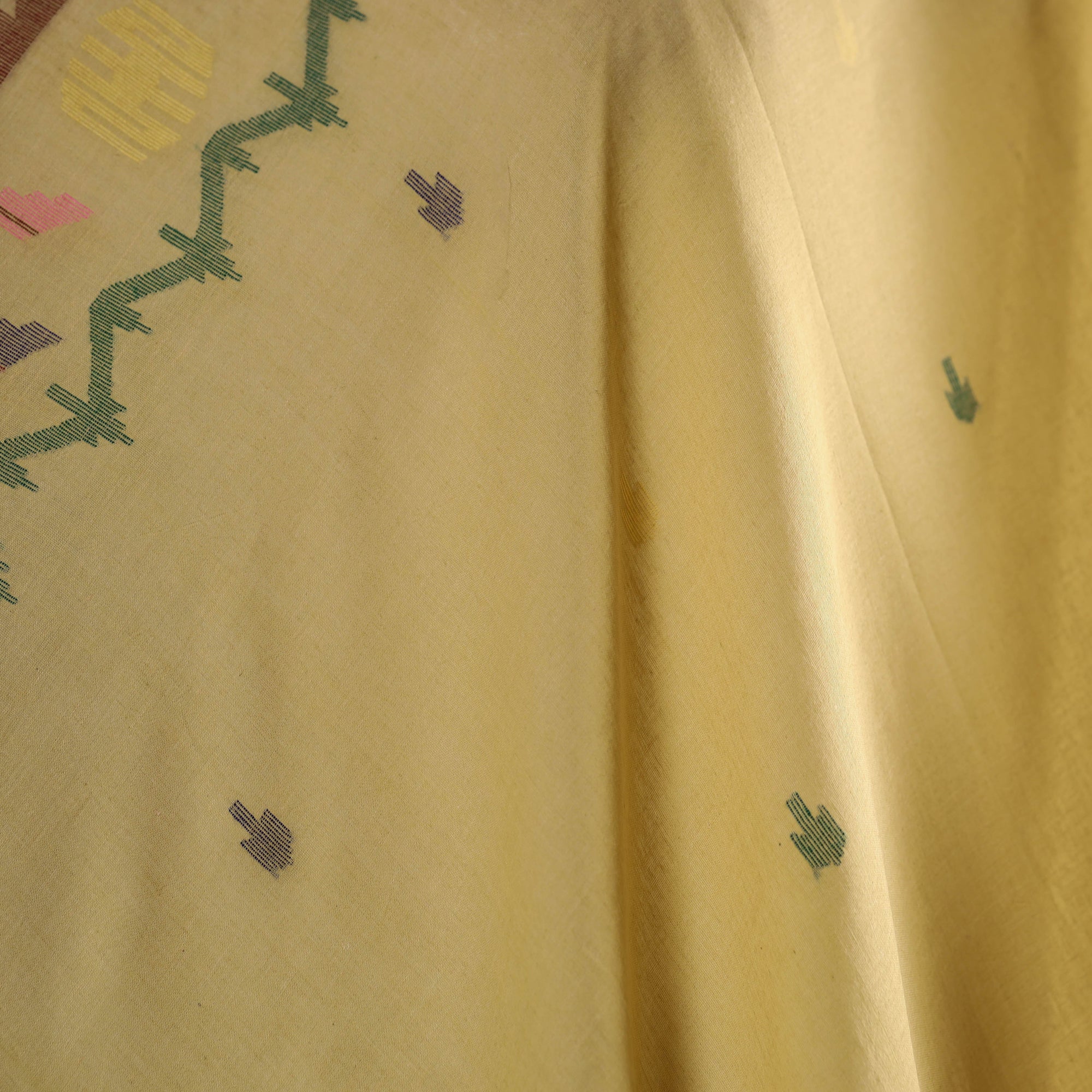 This yellow phulia jamdani cotton fabric reflects Bengal’s rich textile heritage. Woven with the intricate weft technique, each piece requires time and patience to weave. Celebrated for its delicate motifs and elegance, the fabric is ideal for sarees, dupattas, kurtas, or even refined home décor accents.