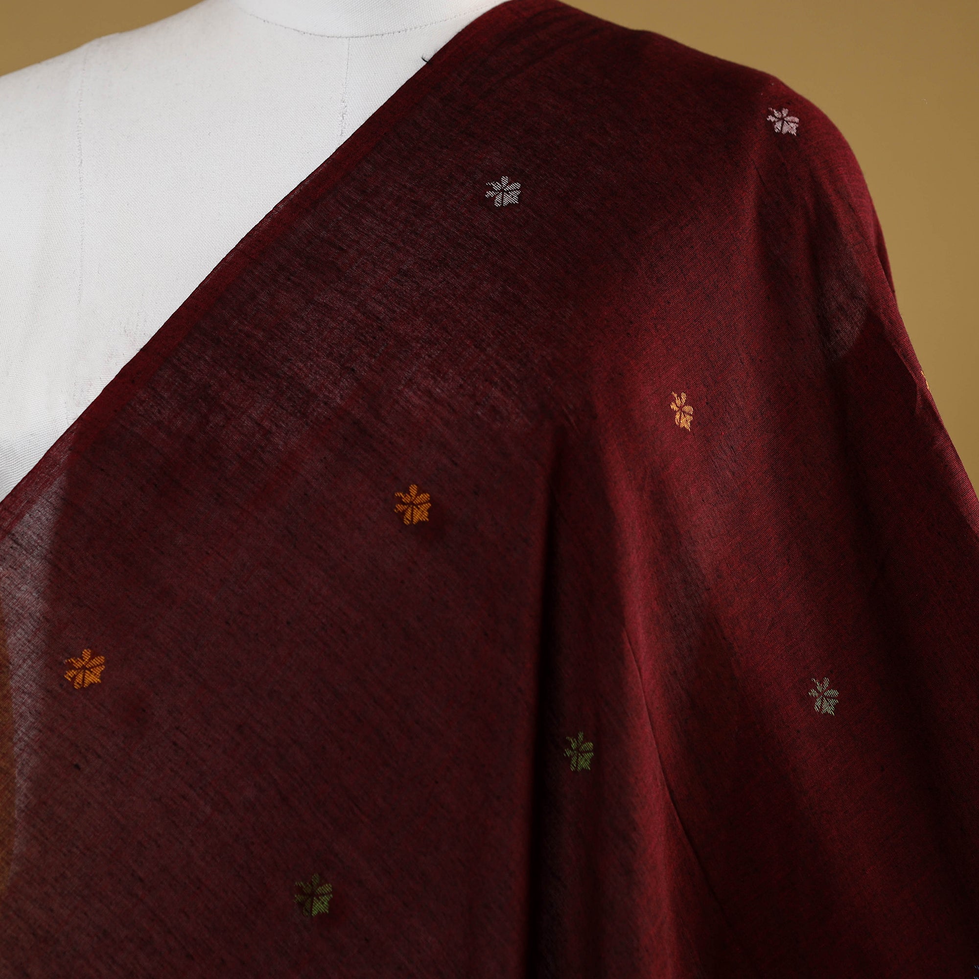 This maroon phulia jamdani cotton fabric reflects Bengal’s rich textile heritage. Woven with the intricate weft technique, each piece requires time and patience to weave. Celebrated for its delicate motifs and elegance, the fabric is ideal for sarees, dupattas, kurtas, or even refined home décor accents.