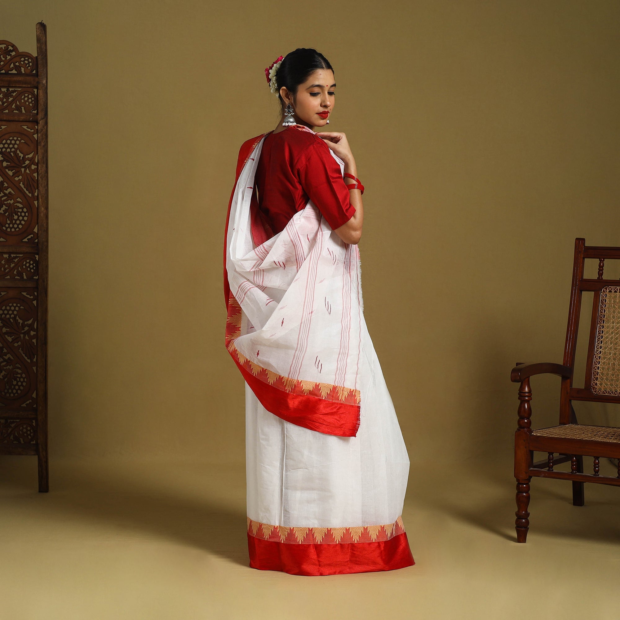 This white handloom cotton phulia jamdani saree showcases a weaving technique unique to Bengal, where motifs are created directly on the loom, much like embroidery. Crafted by skilled artisans and finished with a rich velvet border, it reflects the cultural richness of Bengal. A perfect choice for those who appreciate traditional, sustainable fashion.