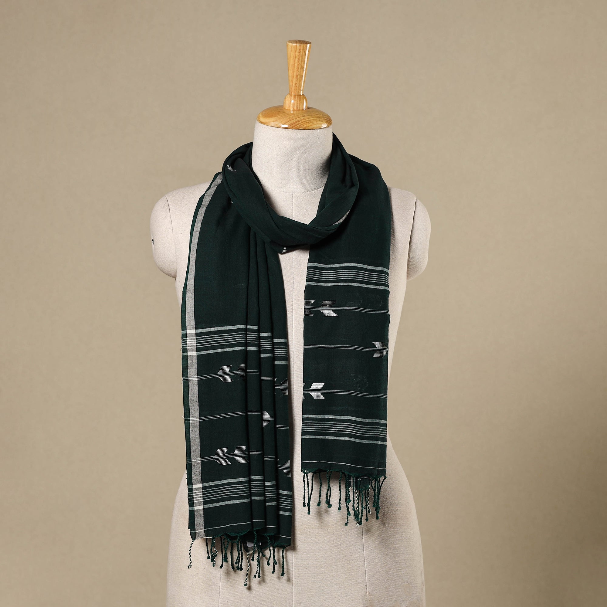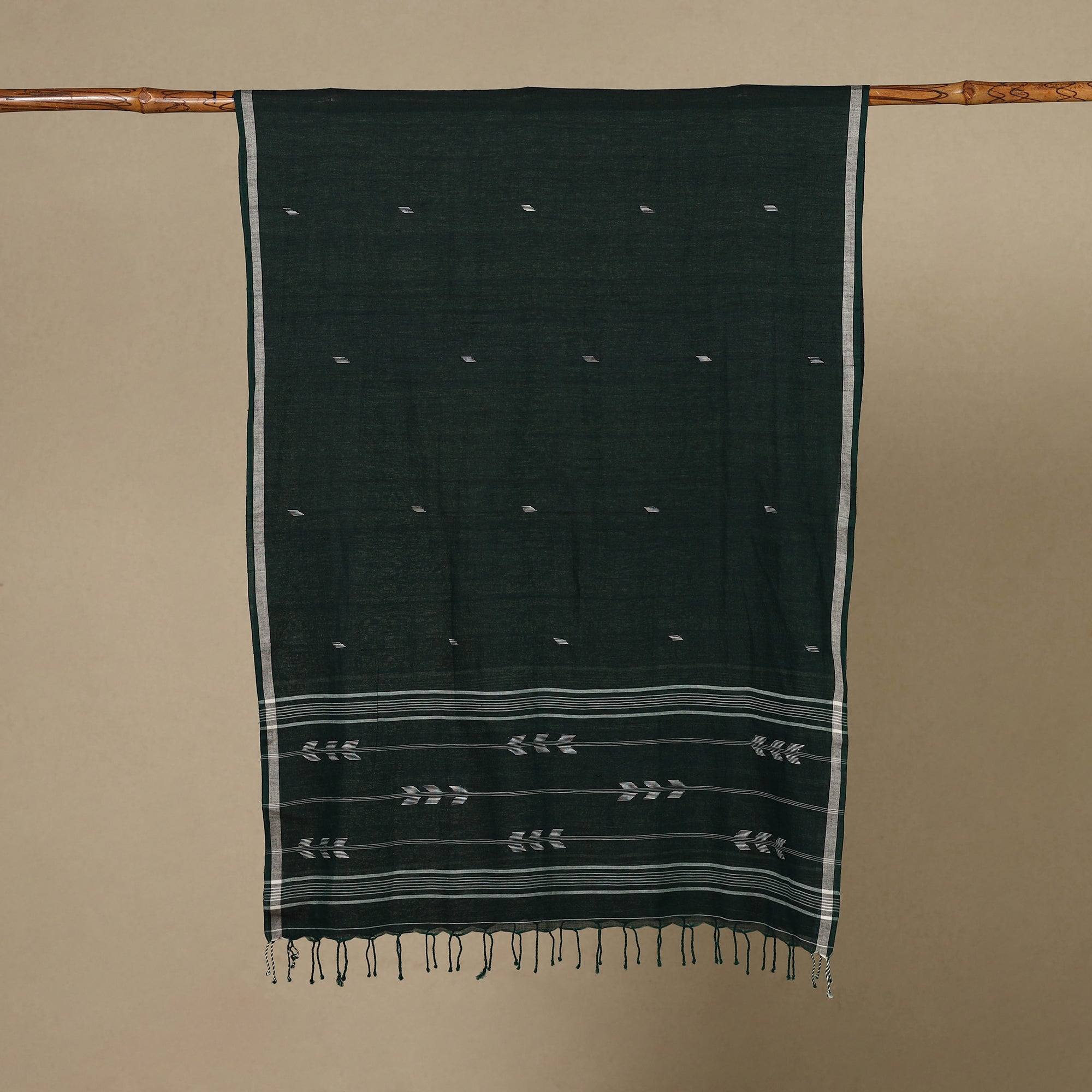 This green phulia jamdani cotton handloom stole, adorned with traditional buti work and tassels, showcases the beauty of Jamdani weaving. Originating from Bengal, this intricate technique involves weaving delicate patterns with an extra weft, creating designs that appear as if embroidered directly on the loom. Each stole reflects the artisanal skill passed down through generations. Nice for everyday wear and special occasions.