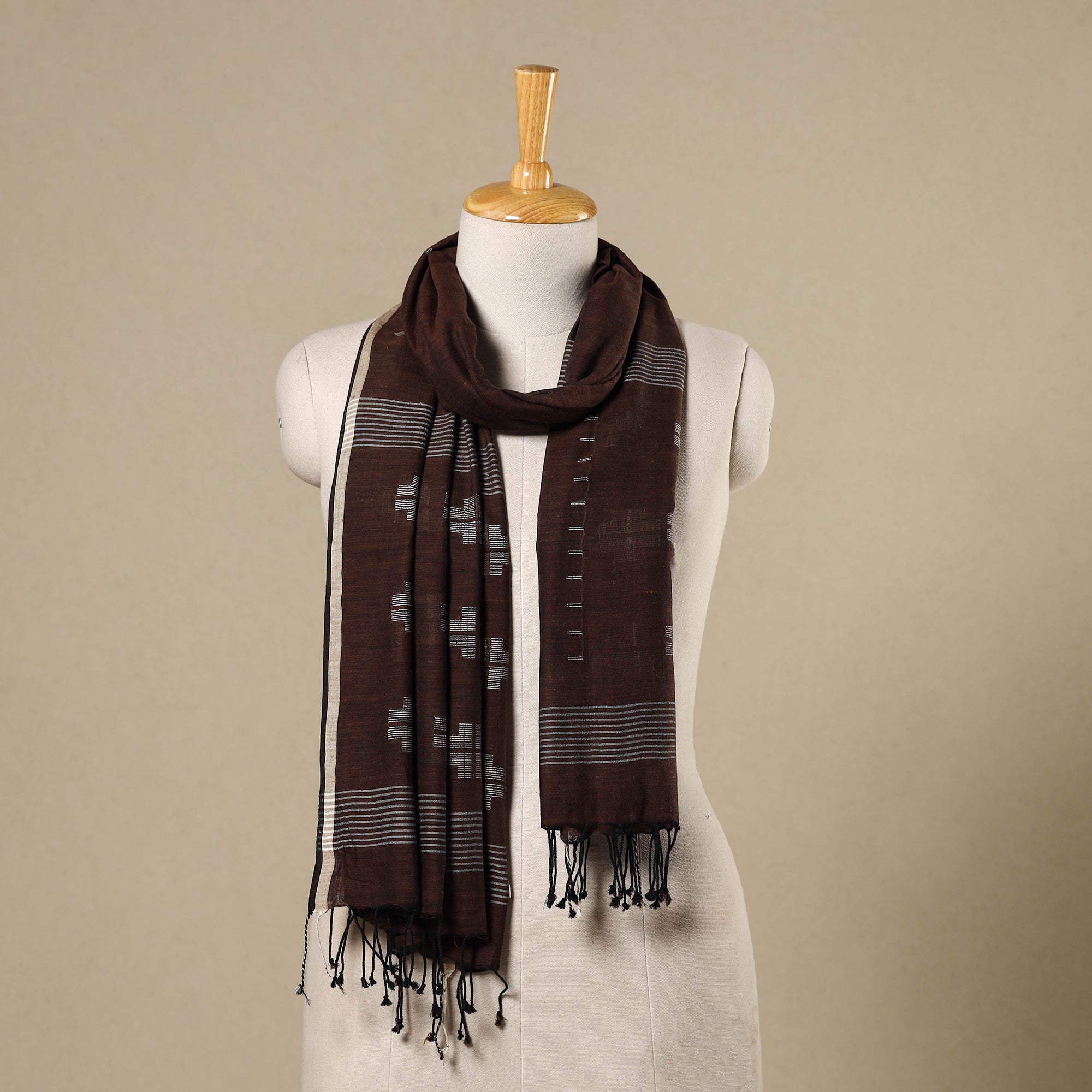 This brown phulia jamdani cotton handloom stole, adorned with traditional buti work and tassels, showcases the beauty of Jamdani weaving. Originating from Bengal, this intricate technique involves weaving delicate patterns with an extra weft, creating designs that appear as if embroidered directly on the loom. Each stole reflects the artisanal skill passed down through generations. Nice for everyday wear and special occasions.