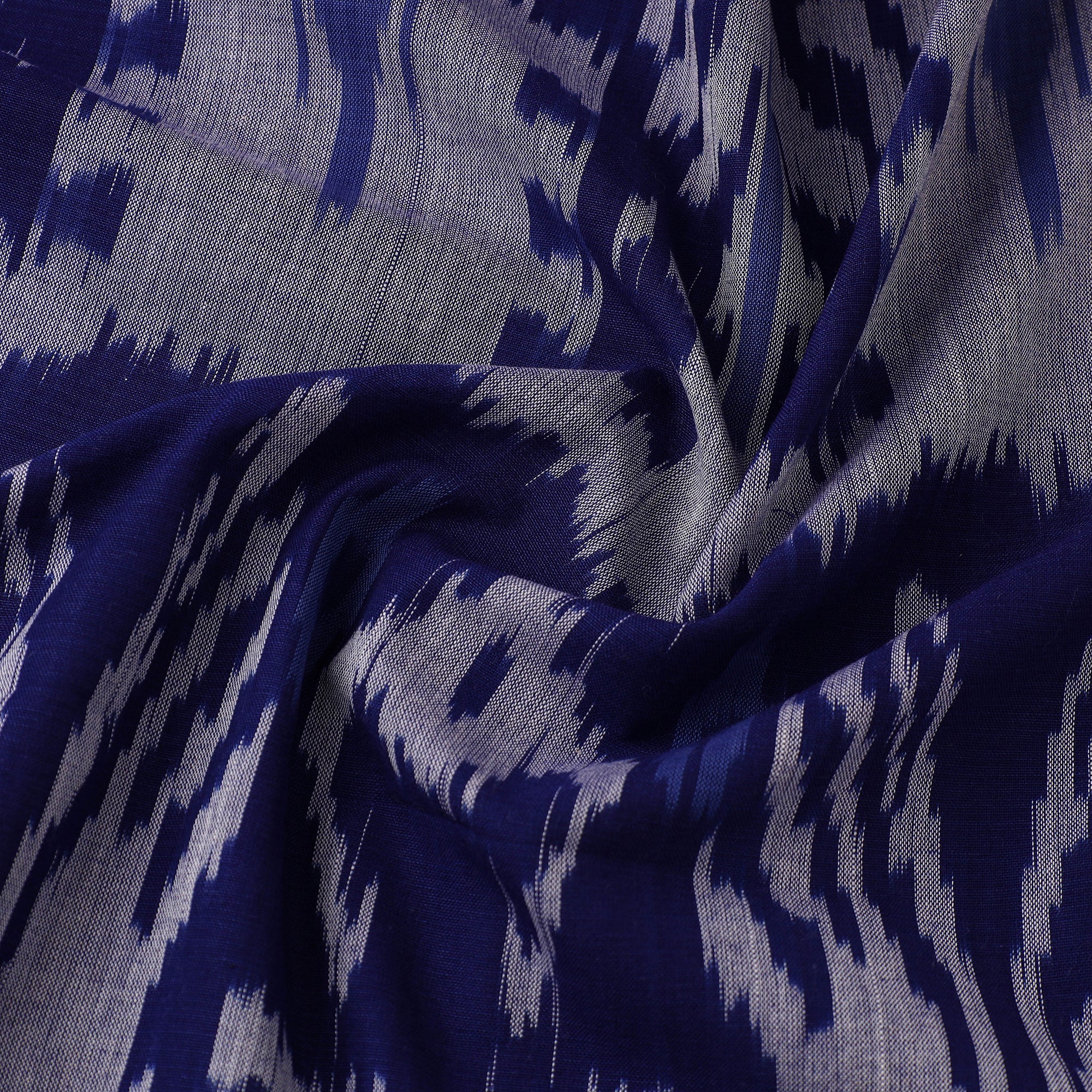 This blue mercerised cotton pochampally Ikat fabric from Telangana is crafted using the traditional resist-dye technique, where threads are dyed before weaving. This process enables geometric patterns to appear with clarity and precision. Known for its rich texture and vibrant colours, the fabric is perfect for ethnic wear, home décor, and creative stitching projects.
