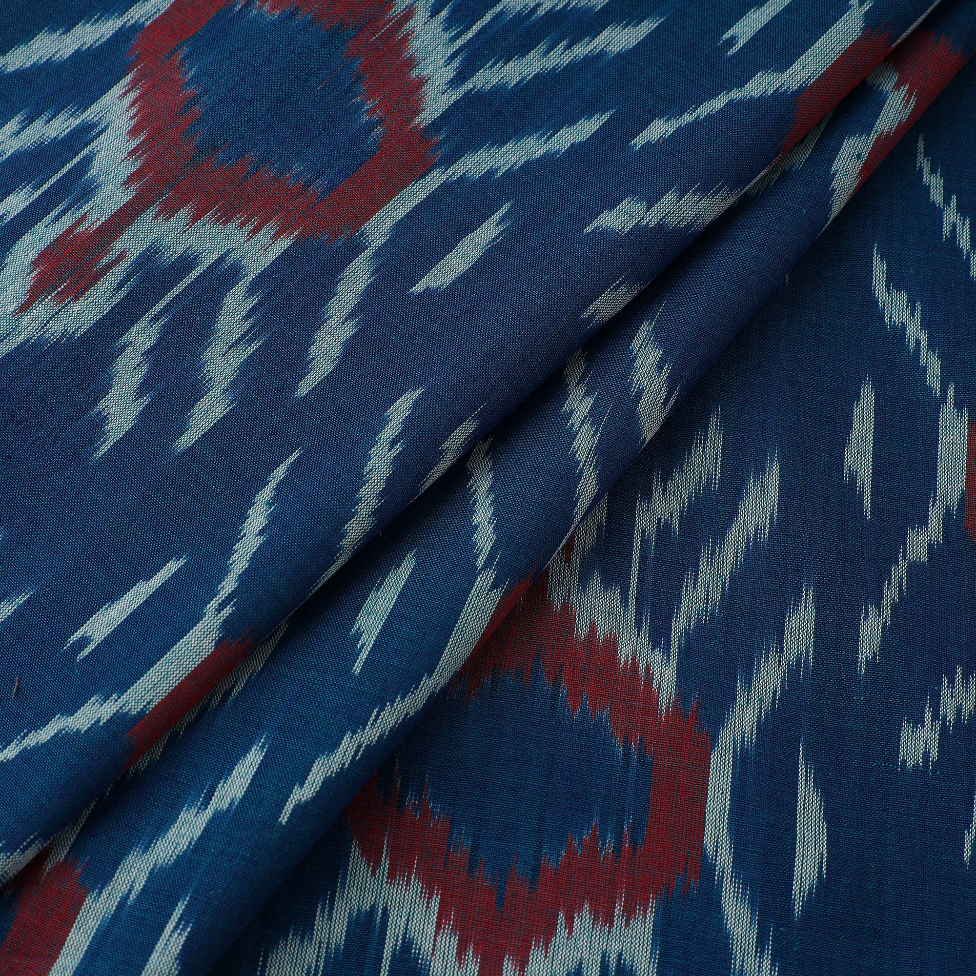 This blue mercerised cotton pochampally Ikat fabric from Telangana is crafted using the traditional resist-dye technique, where threads are dyed before weaving. This process enables geometric patterns to appear with clarity and precision. Known for its rich texture and vibrant colours, the fabric is perfect for ethnic wear, home décor, and creative stitching projects.